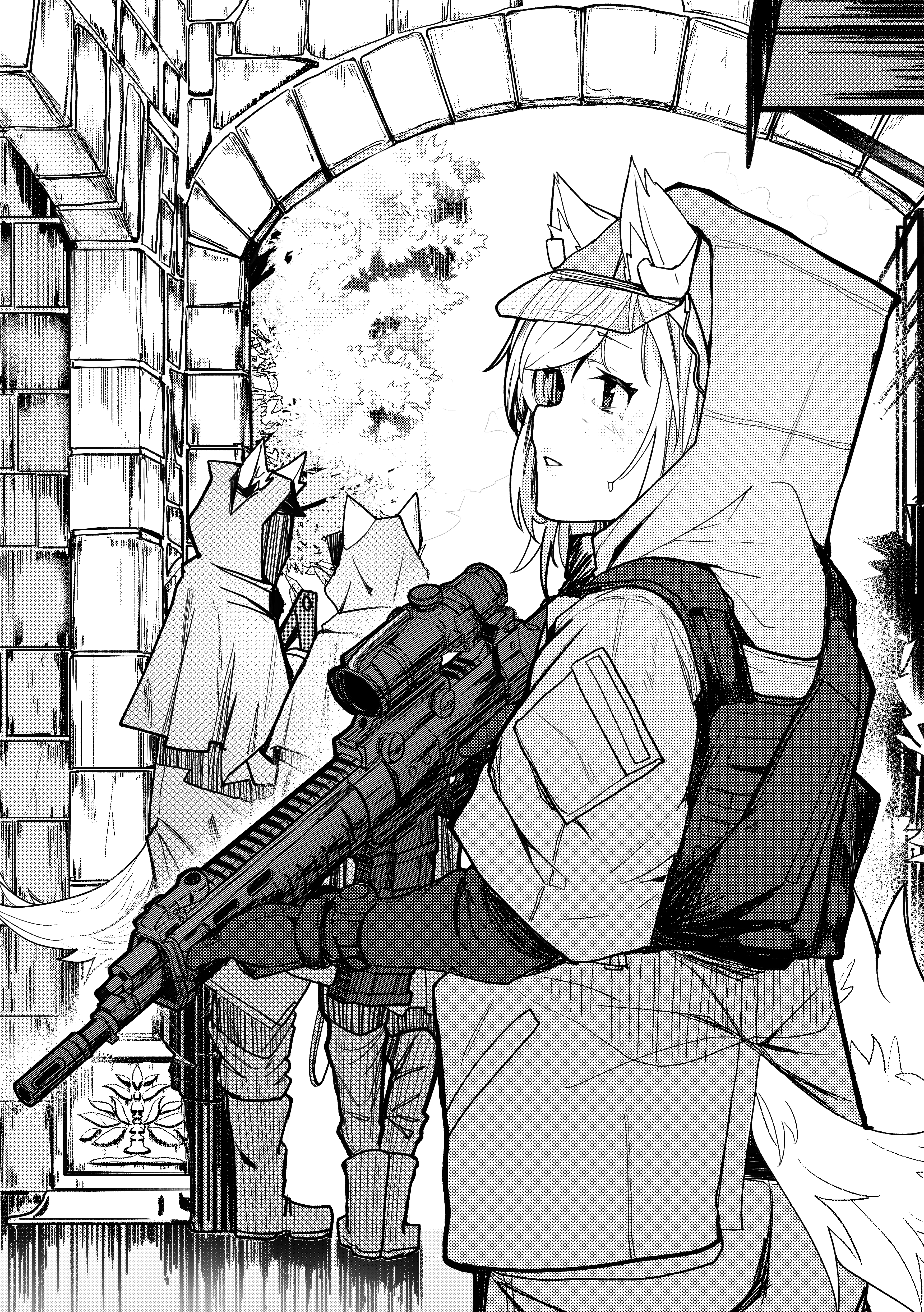 1girl 2others absurdres animal_ear_fluff animal_ears ao_homura baseball_cap boots bulletproof_vest commentary dithering earphones ears_through_headwear from_side greyscale gun hat highres holding holding_gun holding_weapon hood hooded_jacket jacket load_bearing_vest magazine_(weapon) medium_hair monochrome multiple_others original pants parted_lips qbz-192 scope stone_building stone_wall tactical_clothes tail tree watch water_drop weapon