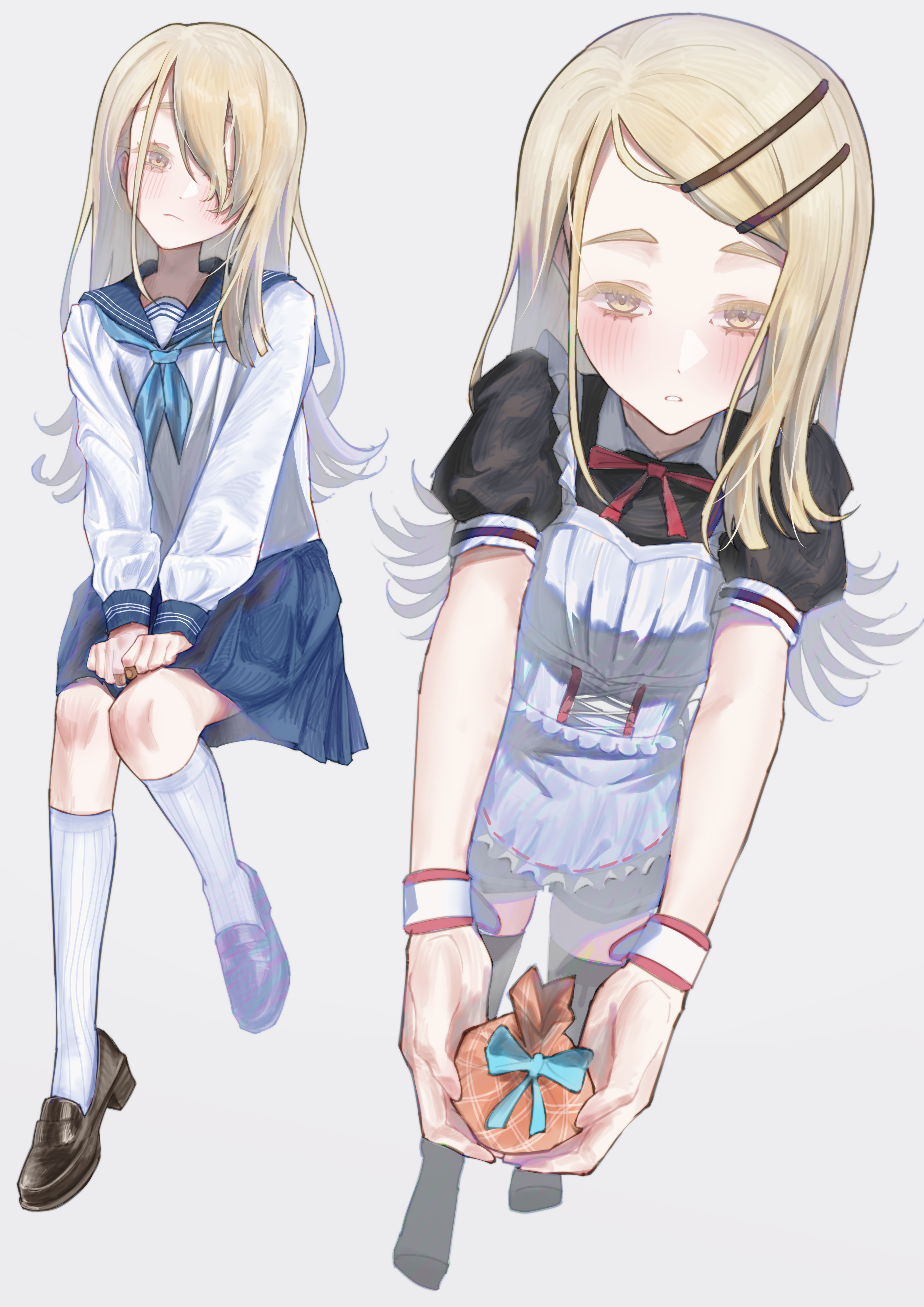 1girl :o absurdres apron blush crane666 flipped_hair gakuen_idolmaster hair_over_one_eye highres idolmaster incoming_gift invisible_chair long_hair looking_at_viewer multiple_views puffy_short_sleeves puffy_sleeves school_uniform serafuku shinosawa_hiro short_sleeves simple_background sitting socks valentine very_long_hair white_apron white_background white_socks