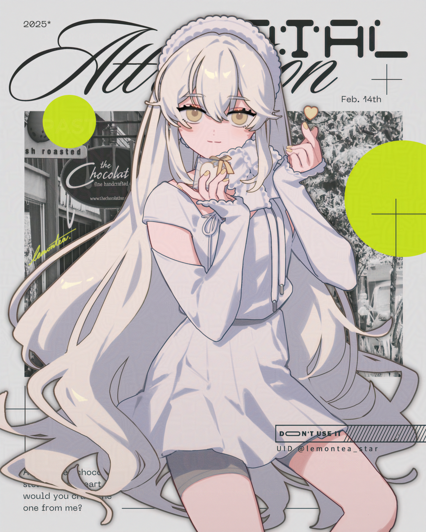 1girl artist_name bow closed_mouth commentary_request english_text feet_out_of_frame finger_heart gift grey_shorts hairband heart highres holding holding_gift lemontea long_hair long_sleeves looking_at_viewer nail_polish original shorts shorts_under_skirt skirt sleeves_past_wrists smile solo standing valentine very_long_hair white_bow white_hair white_hairband white_skirt yellow_eyes yellow_nails