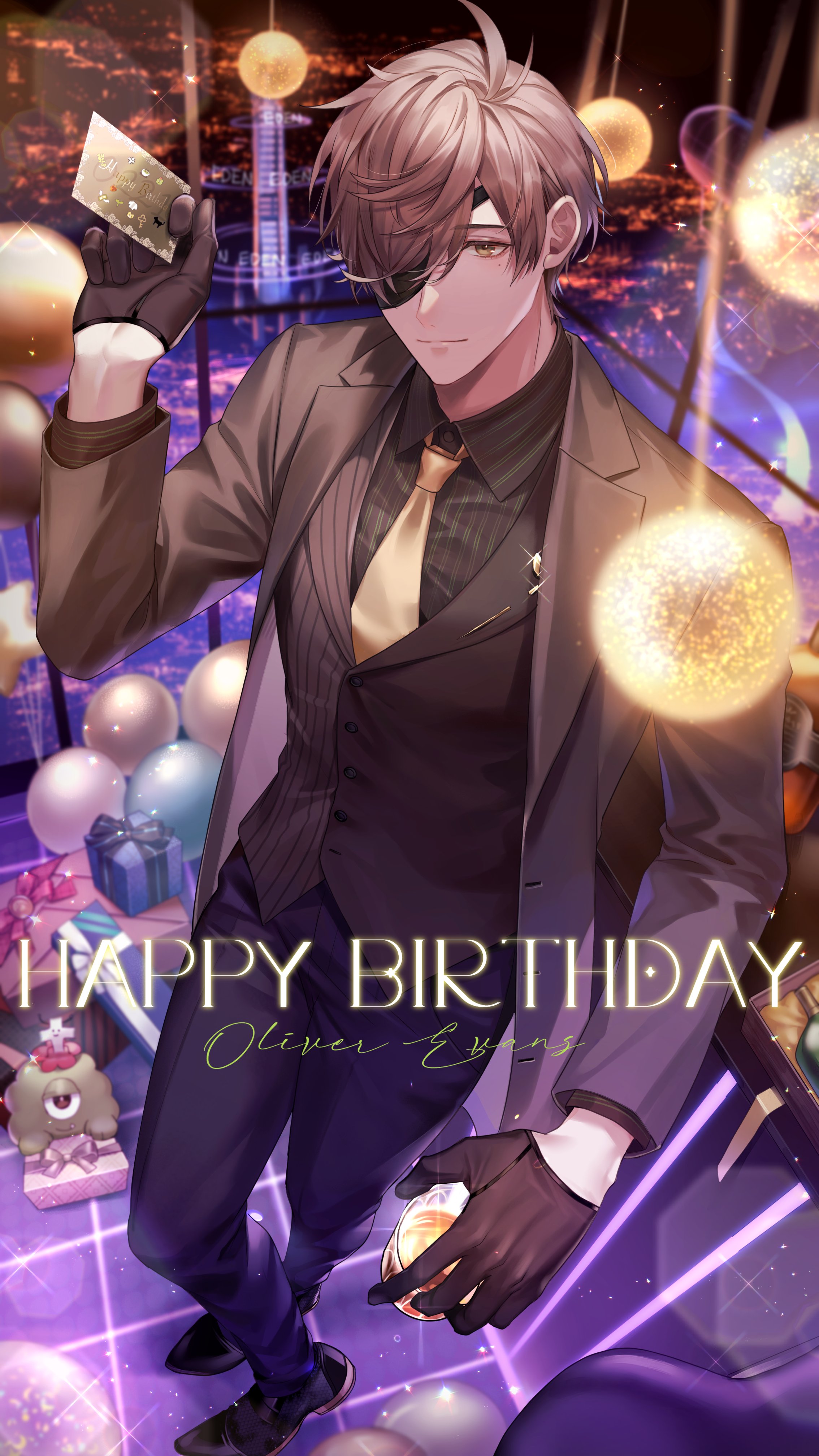 1boy absurdres alcohol antenna_hair balloon birthday birthday_card black_gloves black_pants black_shirt black_shoes black_vest blurry blurry_background box brown_hair buttons card character_name city city_lights closed_mouth coat collared_shirt commentary commentary_request cup english_commentary eyepatch from_above gift gift_box gloves green_coat green_eyes grey_vest hair_between_eyes hand_up happy_birthday highres holding holding_card holding_cup indoors lapels lens_flare light_particles long_sleeves looking_at_viewer male_focus mixed-language_commentary mole mole_under_eye natsuki_(naki_zemisei) necktie night nijisanji official_alternate_costume oliver_evans oliver_evans_(3rd_costume) one_eye_covered open_clothes open_coat pants parted_bangs shirt shoes short_hair smile solo sparkle standing striped_clothes striped_shirt striped_vest tile_floor tiles vertical-striped_clothes vertical-striped_shirt vertical-striped_vest vest virtual_youtuber wing_collar yellow_necktie