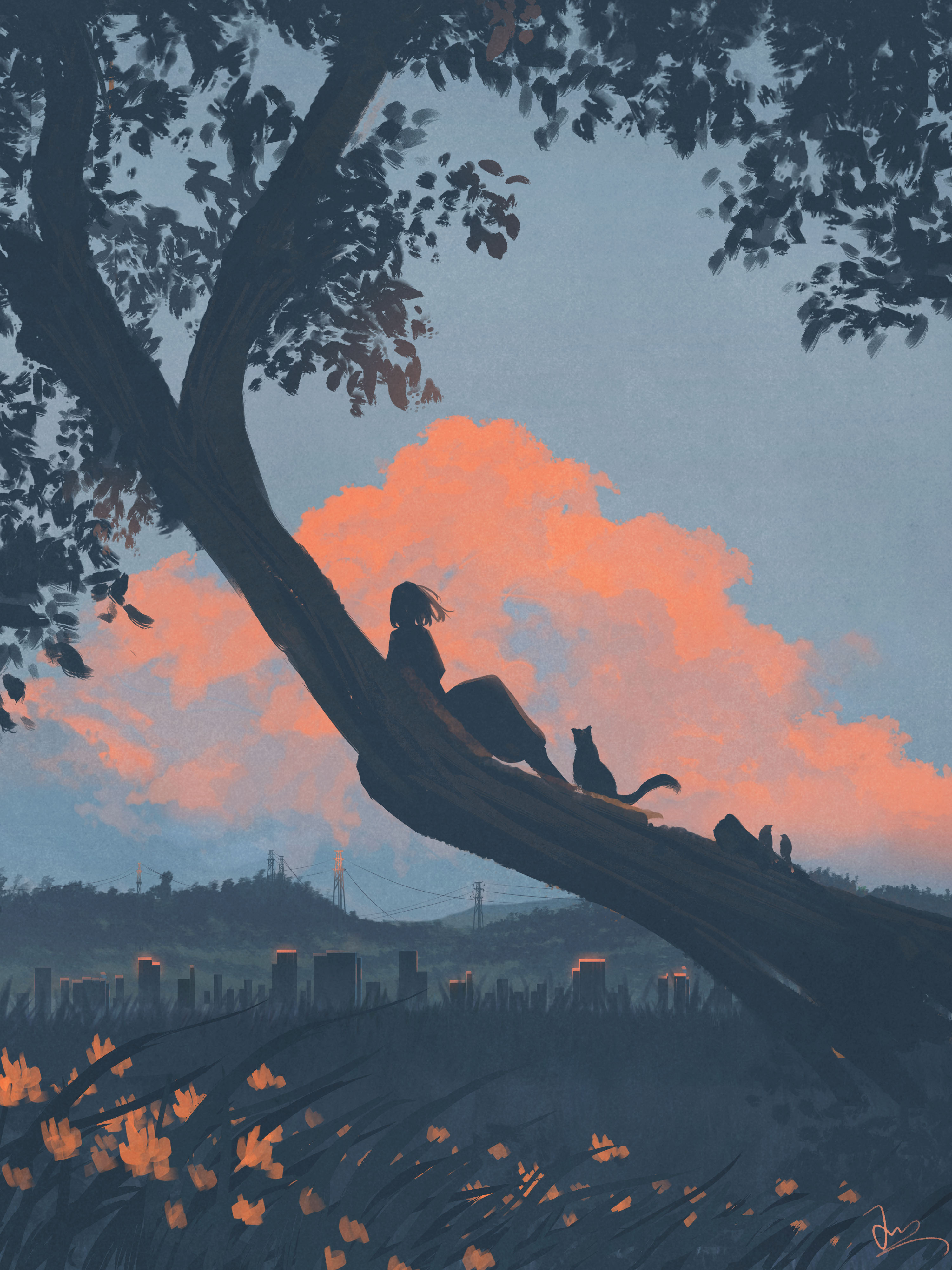 1girl absurdres black_cat blue_sky cat cloud cloudy_sky cumulonimbus_cloud dress evening facing_away floating_hair from_behind grass highres huashijw in_tree landscape long_dress mountainous_horizon nature original outdoors power_lines scenery short_hair signature silhouette sitting sitting_in_tree sky solo transformer tree wide_shot wind