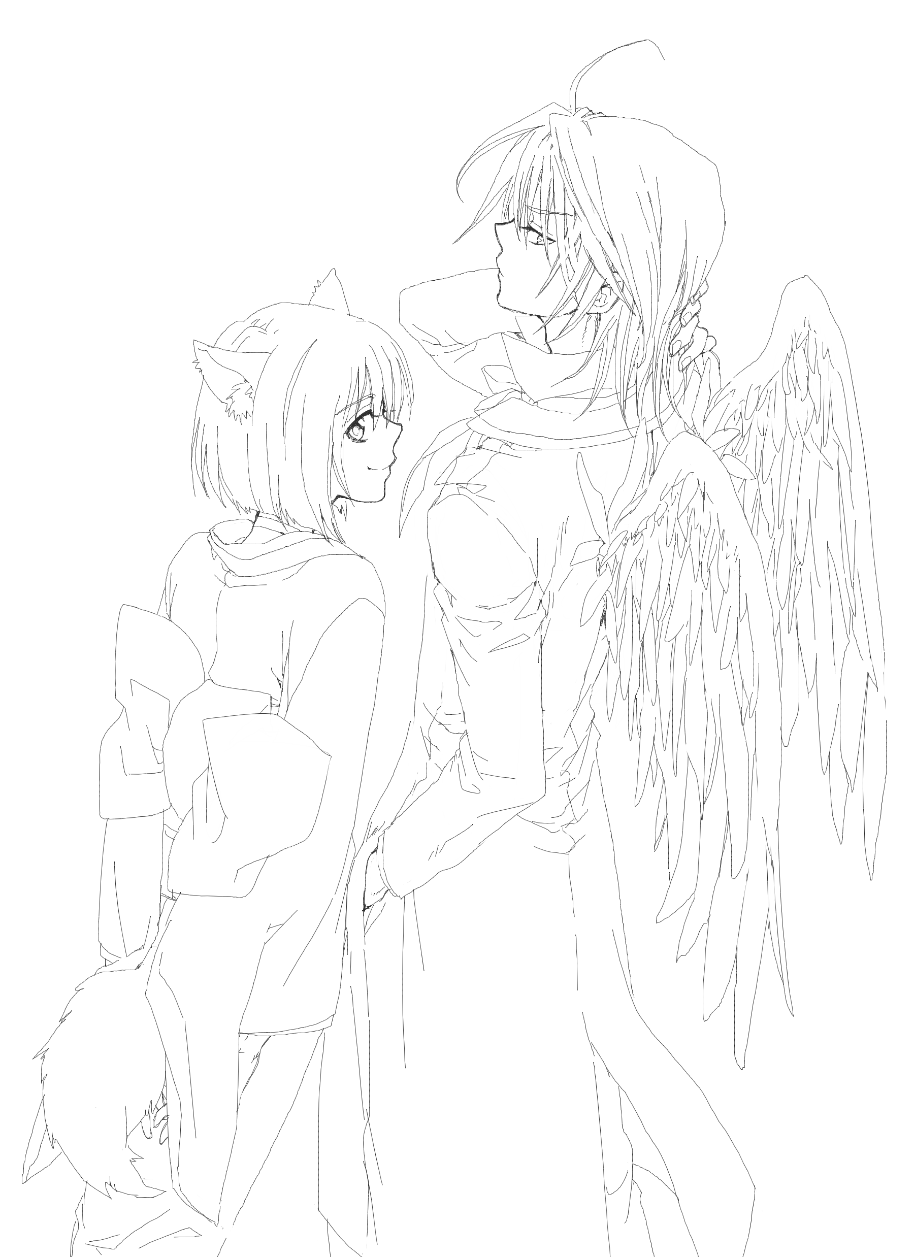 1boy 1girl absurdres animal_ear_fluff animal_ears arms_behind_back bob_cut choker coat feathered_wings fox_ears fox_girl fox_tail frown hand_in_pocket hand_on_own_neck haruka_(tactics) highres japanese_clothes kimono kitsune lineart monochrome obi sash short_hair smile tactics tail tengu traditional_youkai wings youko_(tactics) yuki_(hello_idiot)