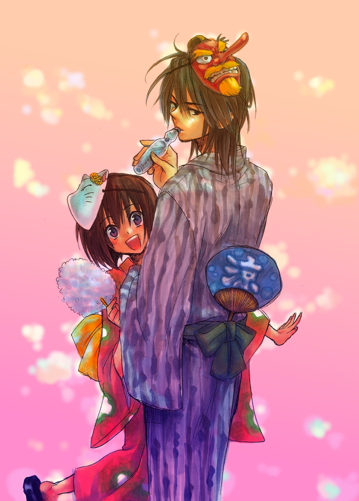 1boy 1girl black_eyes black_hair blue_kimono bob_cut bottle brown_hair cotton_candy drinking floral_print floral_print_kimono food fox_mask graphite_(medium) hand_fan hand_fan_writing haruka_(tactics) height_difference holding holding_bottle holding_cotton_candy holding_fan holding_food japanese_clothes kimono looking_at_viewer mask mask_on_head mixed_media open_mouth painting_(medium) paper_fan pink_kimono print_kimono purple_eyes ramune short_hair smile standing standing_on_one_leg striped_clothes striped_kimono tactics tengu_mask traditional_media uchiwa watercolor_(medium) youko_(tactics) yukata yuki_(hello_idiot)