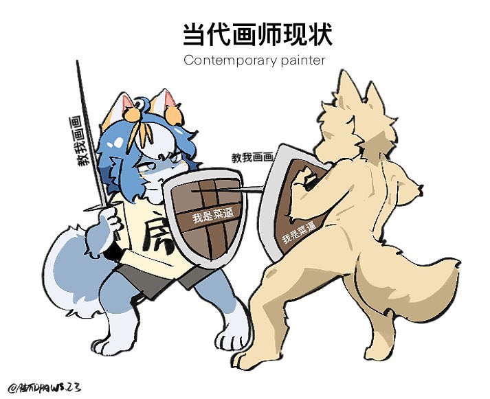 ahoge alea_jacta_est_(meme) animal_ear_fluff blue_eyes blue_fur blue_hair chinese_commentary chinese_text dpaws fencing furry holding holding_shield maimai_(game) meme original shield simplified_chinese_text translated