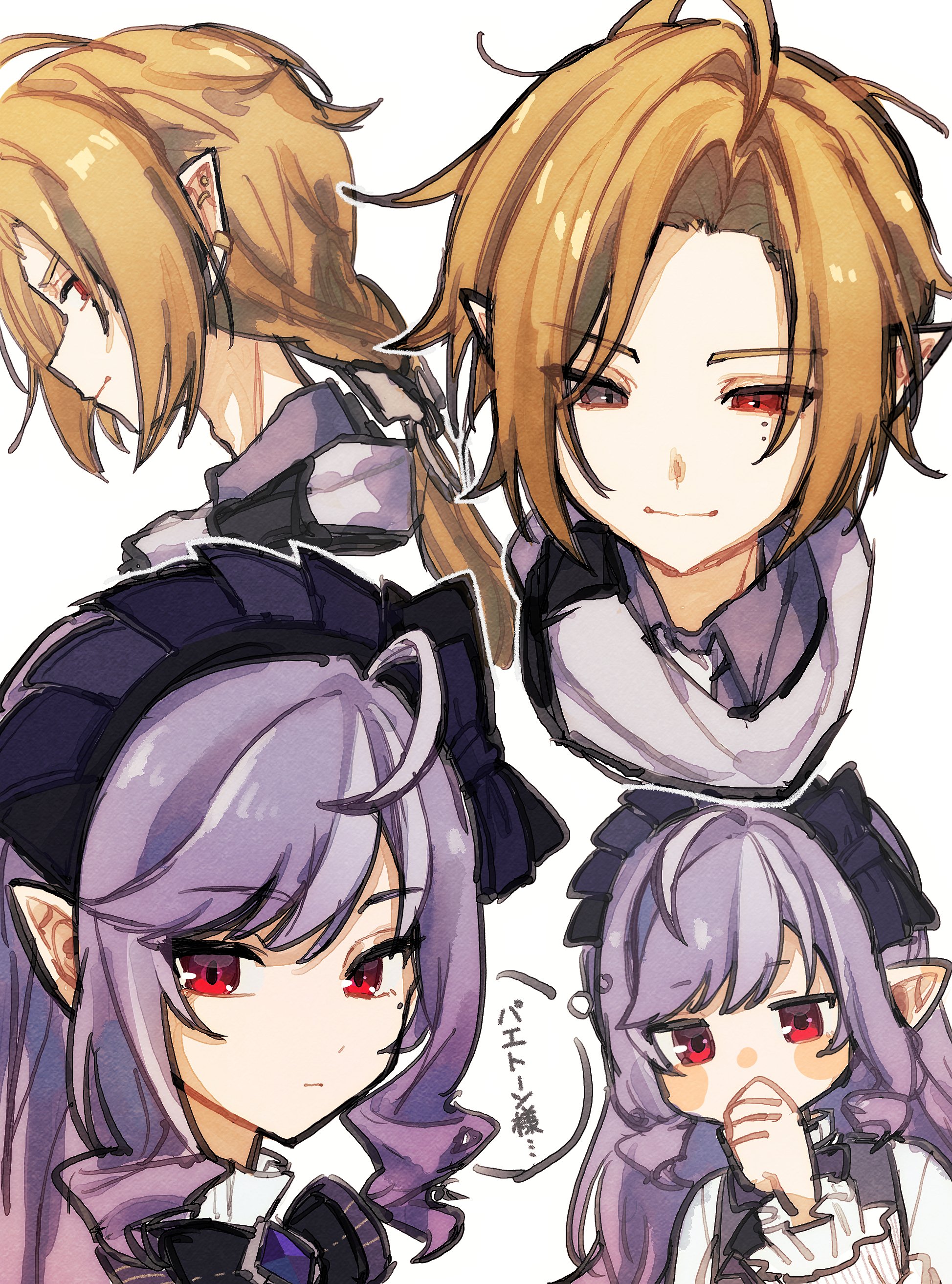 1boy 1girl absurdres black_bow black_hairband blonde_hair bow closed_mouth commentary_request ear_piercing hair_between_eyes hairband heterochromia highres hugo_vlad long_hair long_sleeves mole mole_under_eye multiple_views nandaka_0103 piercing pointy_ears purple_hair red_eyes scarf simple_background upper_body vivian_banshee white_background zenless_zone_zero