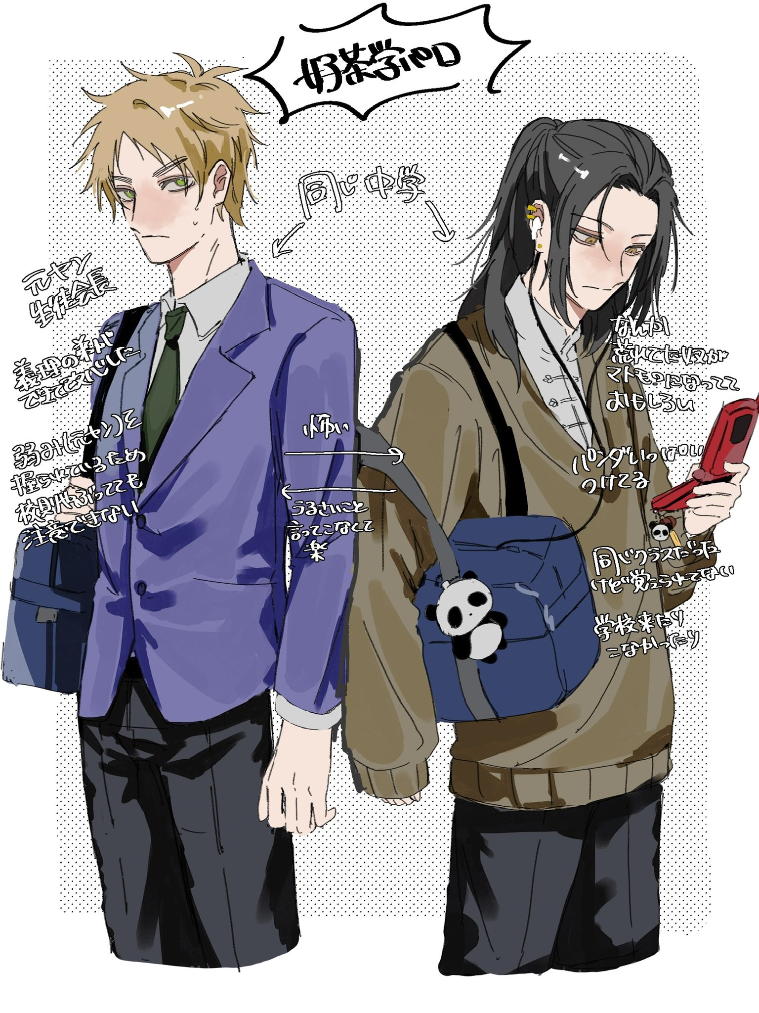 2boys alternate_costume arrow_(symbol) axis_powers_hetalia bag black_hair black_necktie black_pants blazer blonde_hair blue_bag blue_jacket border brown_eyes brown_sweater buttons cellphone charm_(object) china_(hetalia) closed_mouth collared_shirt commentary_request cowboy_shot earclip green_eyes hand_up highres holding holding_phone jacket lapels long_hair long_sleeves looking_at_phone looking_at_viewer male_focus multiple_boys necktie outside_border pants phone polka_dot polka_dot_background puffy_long_sleeves puffy_sleeves shirt short_hair sidelocks solell10 standing sweatdrop sweater translation_request united_kingdom_(hetalia) v-shaped_eyebrows white_background white_border white_shirt