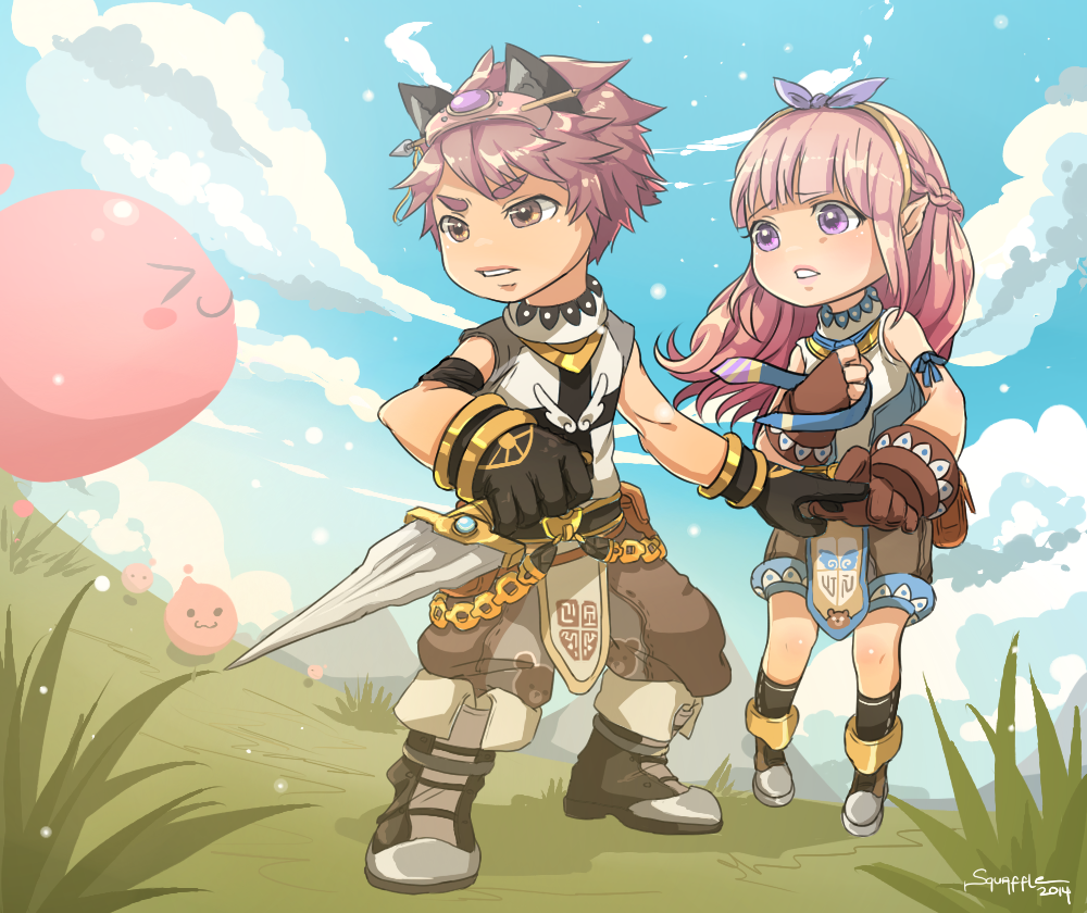 1boy 1girl 2014 :3 animal_ears black_gloves blue_shirt blue_sky blush boots braid brown_eyes brown_gloves brown_hair brown_shorts cat_boy cat_ears cloud commentary cross cross_print dagger english_commentary full_body gloves grass hairband half_up_braid holding holding_dagger holding_knife holding_weapon knife long_hair outdoors pink_hair pointy_ears poring purple_eyes ragnarok_online shirt short_hair shorts sky sleeveless sleeveless_shirt slime_(creature) squaffle1 standing super_novice_(ragnarok_online) turtleneck turtleneck_shirt two-tone_shirt weapon white_shirt yellow_hairband