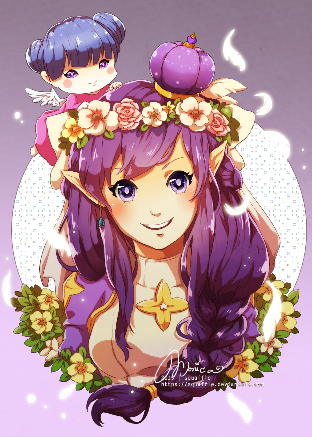 2015 2girls alternate_color blue_hair blush breasts commentary dress english_commentary feathers flower hair_bun hair_flower hair_ornament hiden_zero-two_driver high_priest_(ragnarok_online) highres lady_solace long_hair looking_at_viewer medium_breasts multiple_girls open_mouth pointy_ears purple_background purple_dress purple_eyes purple_hair ragnarok_online smile squaffle1 upper_body white_dress white_flower