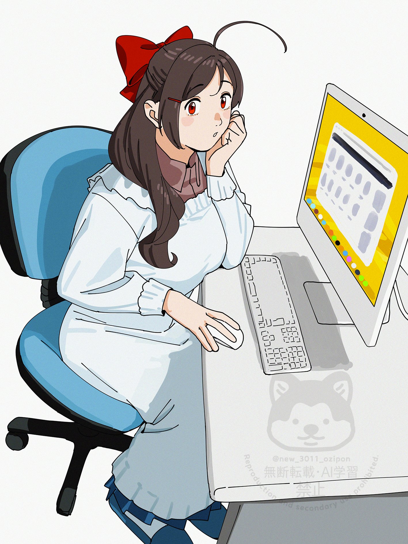 1girl ahoge apron brown_hair brown_shirt collared_shirt computer computer_keyboard desk hair_ribbon highres kantai_collection kappougi long_hair looking_at_viewer mamiya_(kancolle) monitor ojipon red_eyes ribbon shirt simple_background solo watermark white_background
