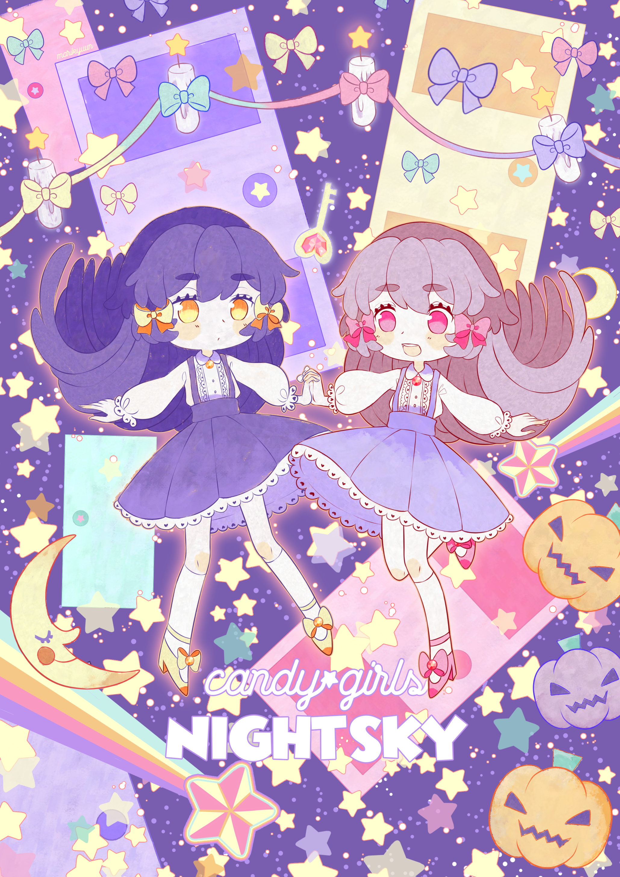 2girls :o absurdres blue_hair blue_skirt blush_stickers bow brooch brown_hair buttons candle center_frills child circle_skirt collared_shirt commentary crescent_moon door english_commentary english_text enjel expressionless eyelashes floating floating_clothes floating_hair footwear_bow frilled_sleeves frills full_body goldia_die_heilige hair_between_eyes hair_bow happy heart high-waist_skirt high_heels highres holding_hands interlocked_fingers jack-o'-lantern jewelry key kneehighs knees lace lace-trimmed_skirt lace_trim leg_up long_hair long_sleeves marikyuunn miniskirt moon multiple_girls open_mouth parted_lips pastel_colors pink_bow pink_eyes pink_shoes pleated_skirt pocket_mirror puffy_long_sleeves puffy_sleeves purple_background purple_bow shirt shoes shooting_star_(symbol) skirt smile socks star_(symbol) star_symbol_background suspender_skirt suspenders teeth thick_eyebrows upper_teeth_only very_long_hair white_shirt white_socks yellow_bow yellow_eyes yellow_shoes