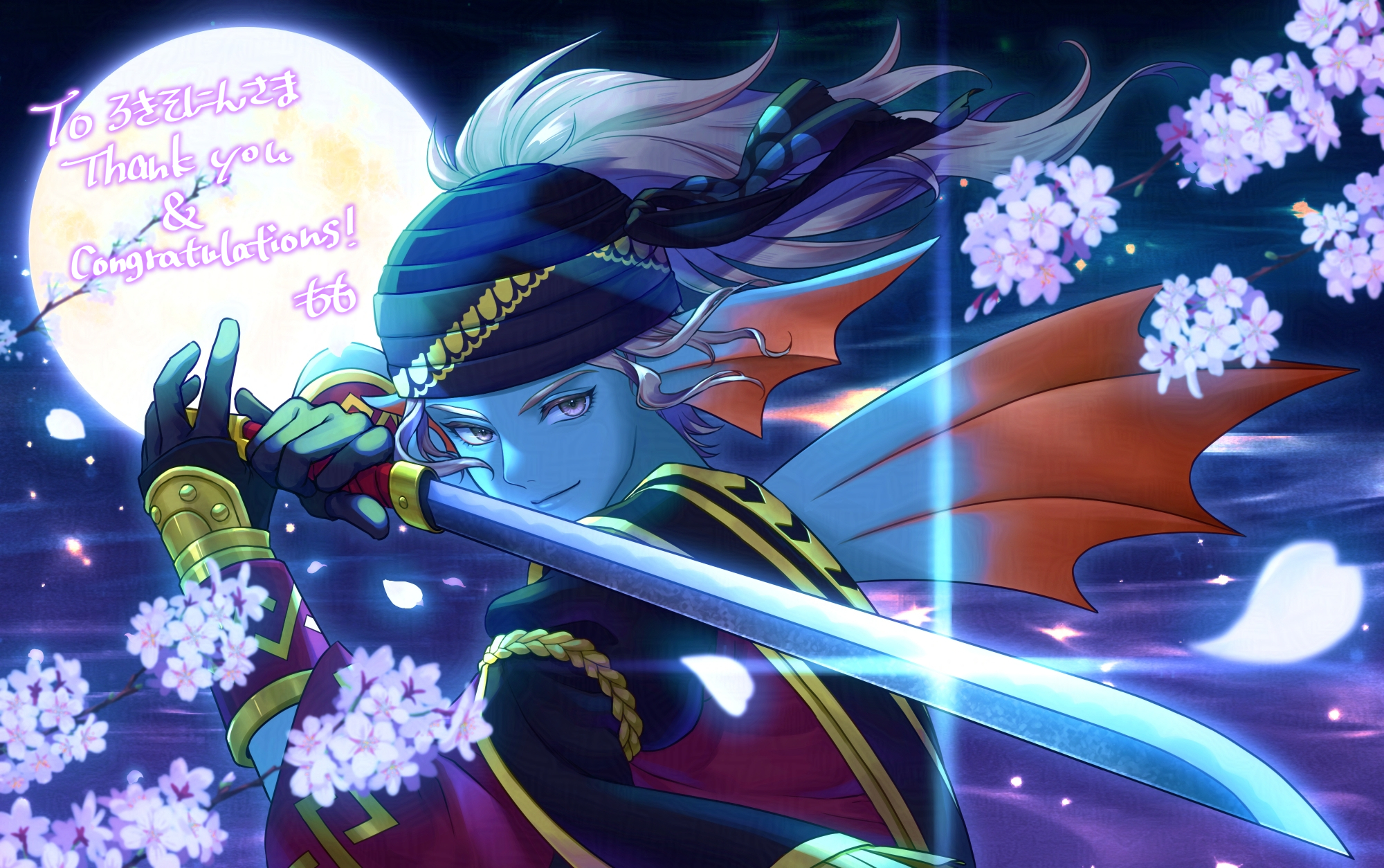 1boy back_fin black_gloves black_turban blue_skin blurry cherry_blossoms colored_eyelashes colored_skin commentary_request commission congratulations depth_of_field dragon_quest dragon_quest_x fins fish_boy floating_clothes floating_hair full_moon gloves glowing grey_eyes head_fins highres holding holding_sword holding_weapon katana looking_at_viewer male_focus momo_nei moon night petals ponytail skeb_commission smile solo sword thank_you upper_body weapon weddie_(dq10) white_hair