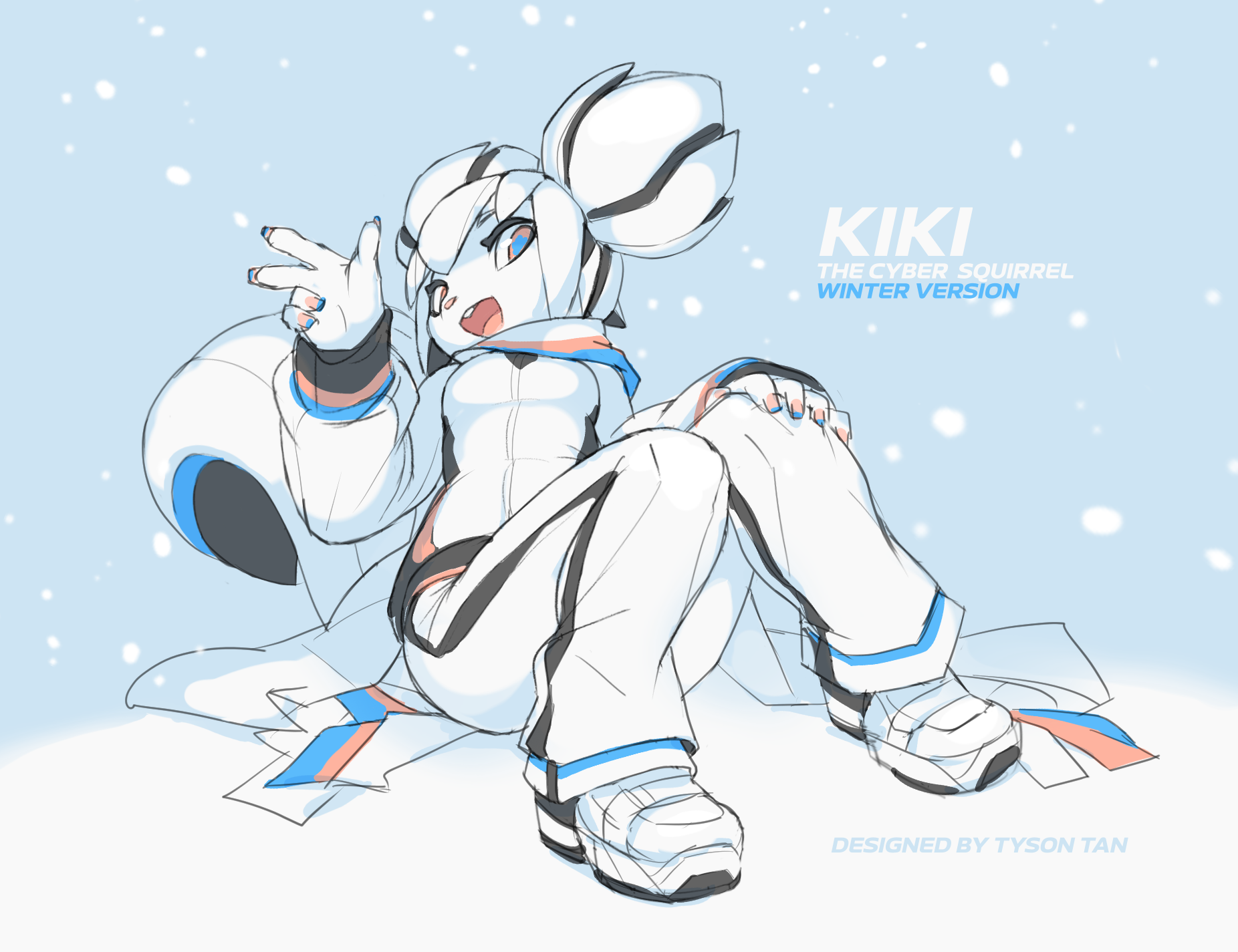 1girl 2017 animal_ears breasts chinese_commentary colored_skin commentary english_commentary furry furry_female head_tilt highres jacket kde kiki_the_cyber_squirrel krita_(medium) krita_(software) long_sleeves looking_at_viewer looking_down mascot medium_breasts on_ground open_mouth original robot scarf signature smile snow snowing squirrel squirrel_ears squirrel_girl squirrel_tail symbol_in_eye tail tyson_tan v white_hair white_jacket white_scarf white_skin winter_clothes