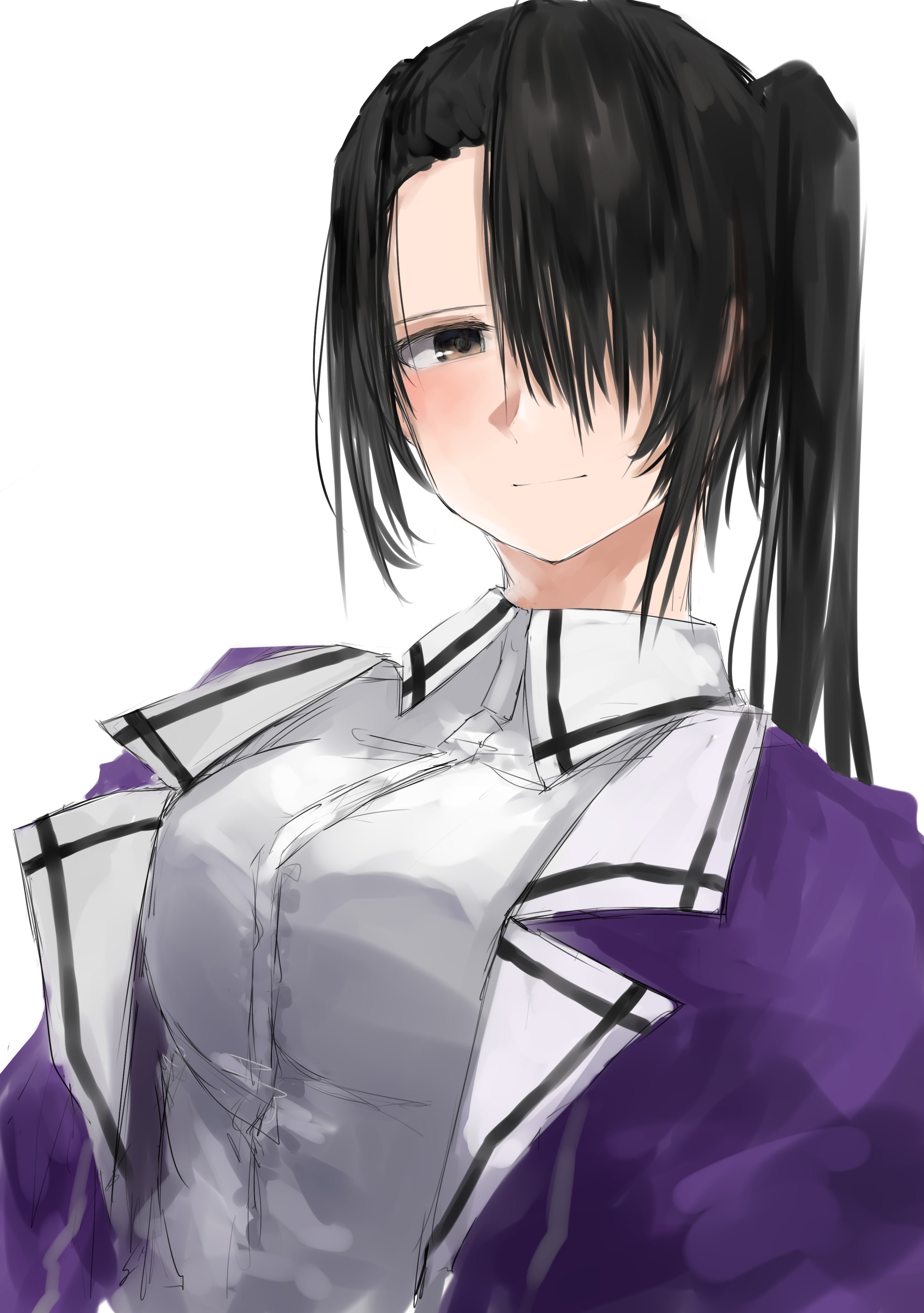 73suke absurdres black_hair brown_eyes collared_shirt dress_shirt hair_over_one_eye highres jacket kantai_collection long_hair nachi_(kancolle) nachi_kai_ni_(kancolle) open_clothes open_jacket purple_jacket shirt side_ponytail simple_background upper_body white_background white_shirt