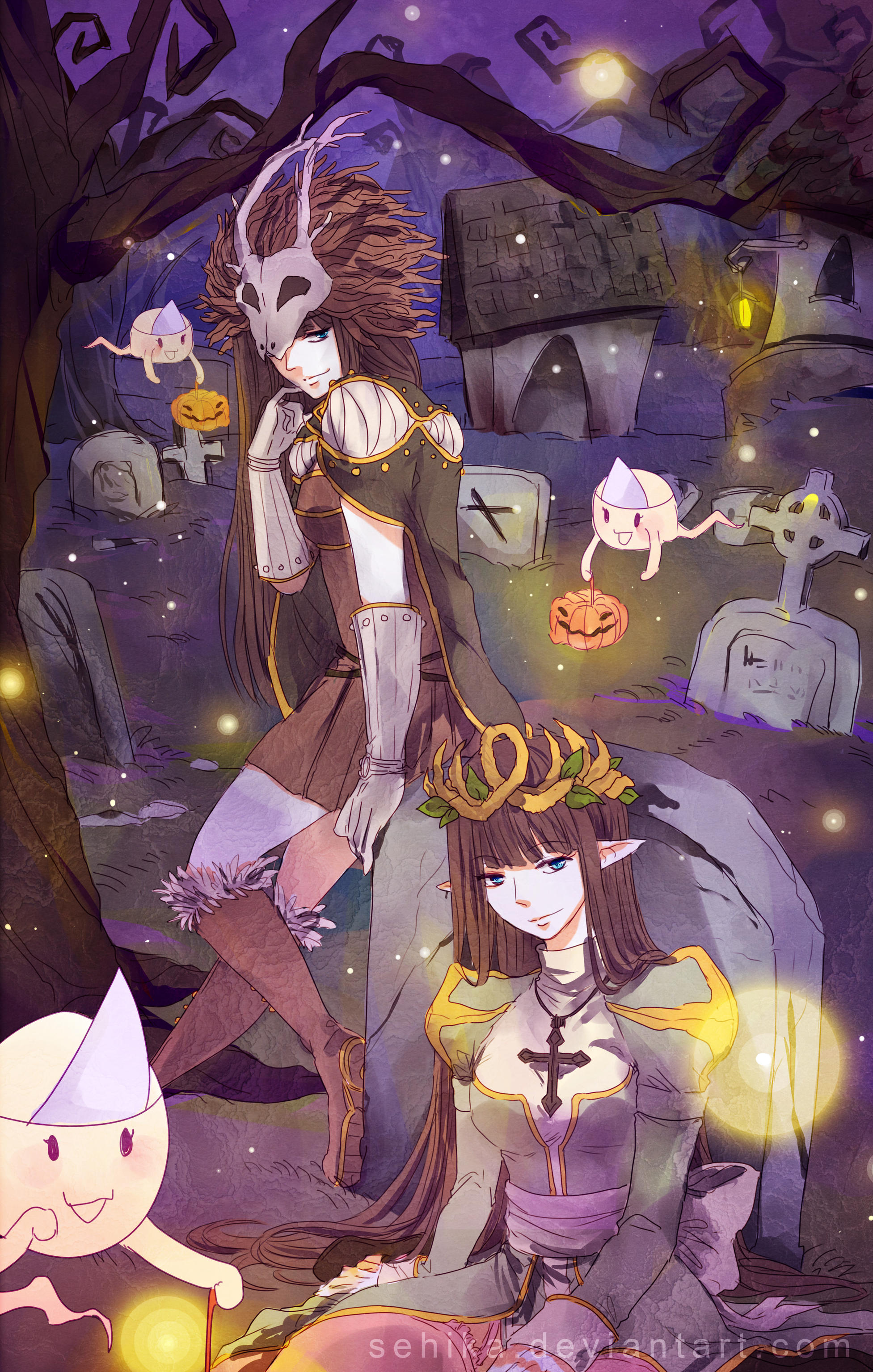 2girls absurdres alternate_color back_bow blue_dress blue_eyes boots bow breasts brown_boots brown_dress brown_hair champourado closed_mouth commentary commission creator_(ragnarok_online) cross cross_necklace dress english_commentary full_body fur-trimmed_boots fur_trim garter_straps ghost gloves graveyard green_eyes high_priest_(ragnarok_online) highres house jack-o'-lantern jewelry juliet_sleeves long_hair long_sleeves looking_at_viewer medium_breasts multiple_girls necklace pointy_ears puffy_sleeves purple_sky ragnarok_online sash sitting sky smile standing tombstone triangular_headpiece two-tone_dress white_bow white_dress white_gloves white_sash