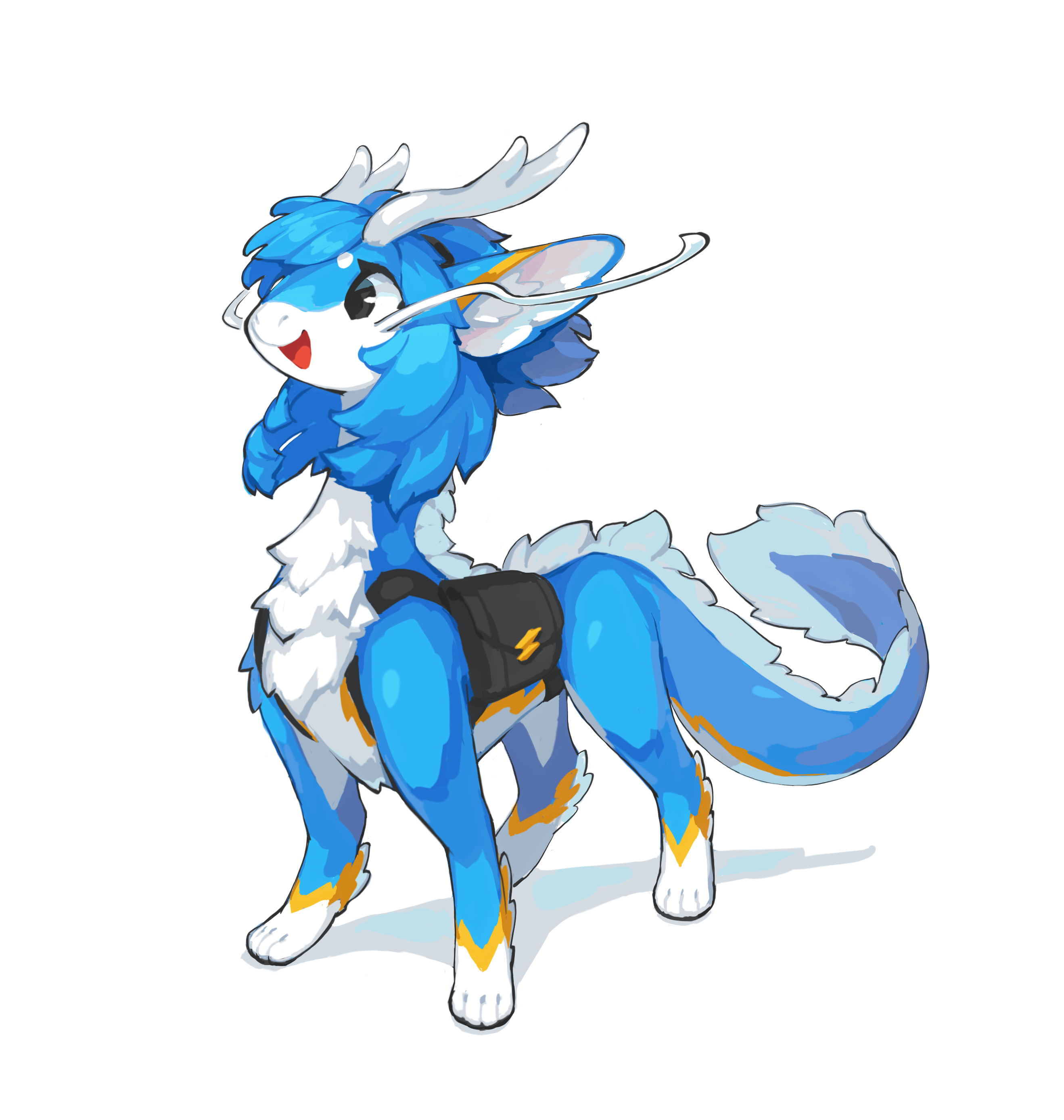 1girl 2023 absurdres animal_hands backpack bag black_eyes blue_fur blue_hair chest_tuft chinese_commentary commentary dragon dragon_girl dragon_horns dragon_tail eastern_dragon english_commentary furry furry_female highres horns krita_(medium) leiting_the_spirit_loong_(animal_form) looking_ahead medium_hair open_mouth original ponytail raised_inner_eyebrows short_ponytail signature simple_background smile spirit_animals_in_disguise standing tail tareme tetrapod tyson_tan very_long_tail