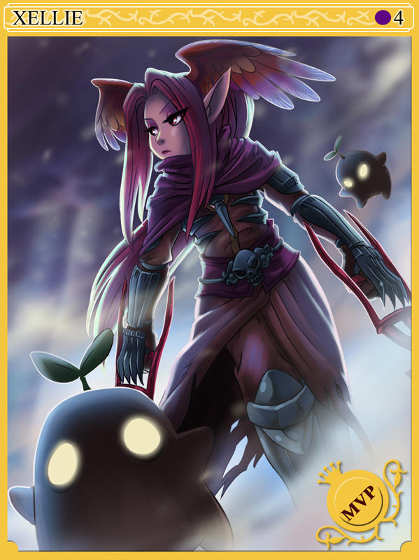 1boy armor assassin_cross_(ragnarok_online) border brown_cape brown_pants brown_shirt cape card_(medium) character_name closed_mouth commentary creature dagger dual_wielding dutch_angle english_commentary expressionless feathered_wings head_wings holding holding_dagger holding_knife holding_weapon jamadhar knife long_hair looking_afar looking_to_the_side male_focus mvp orange_wings pants pauldrons pointy_ears purple_cape purple_hair ragnarok_online red_eyes shirt shoulder_armor smoke solo torn_cape torn_clothes vambraces waist_cape warlockfier weapon wings yellow_border