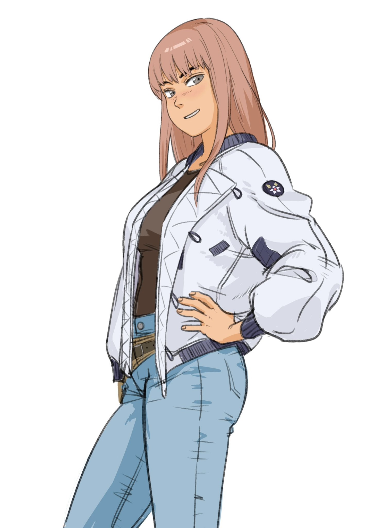 1girl blue_pants blush bomber_jacket breasts brown_shirt cowboy_shot denim grey_eyes grin highres holster iniooooo jacket jeans kiruko_(tengoku_daimakyou) long_hair long_sleeves medium_breasts open_clothes open_jacket pants quilted_jacket shirt shirt_tucked_in simple_background smile solo tengoku_daimakyou white_background white_jacket