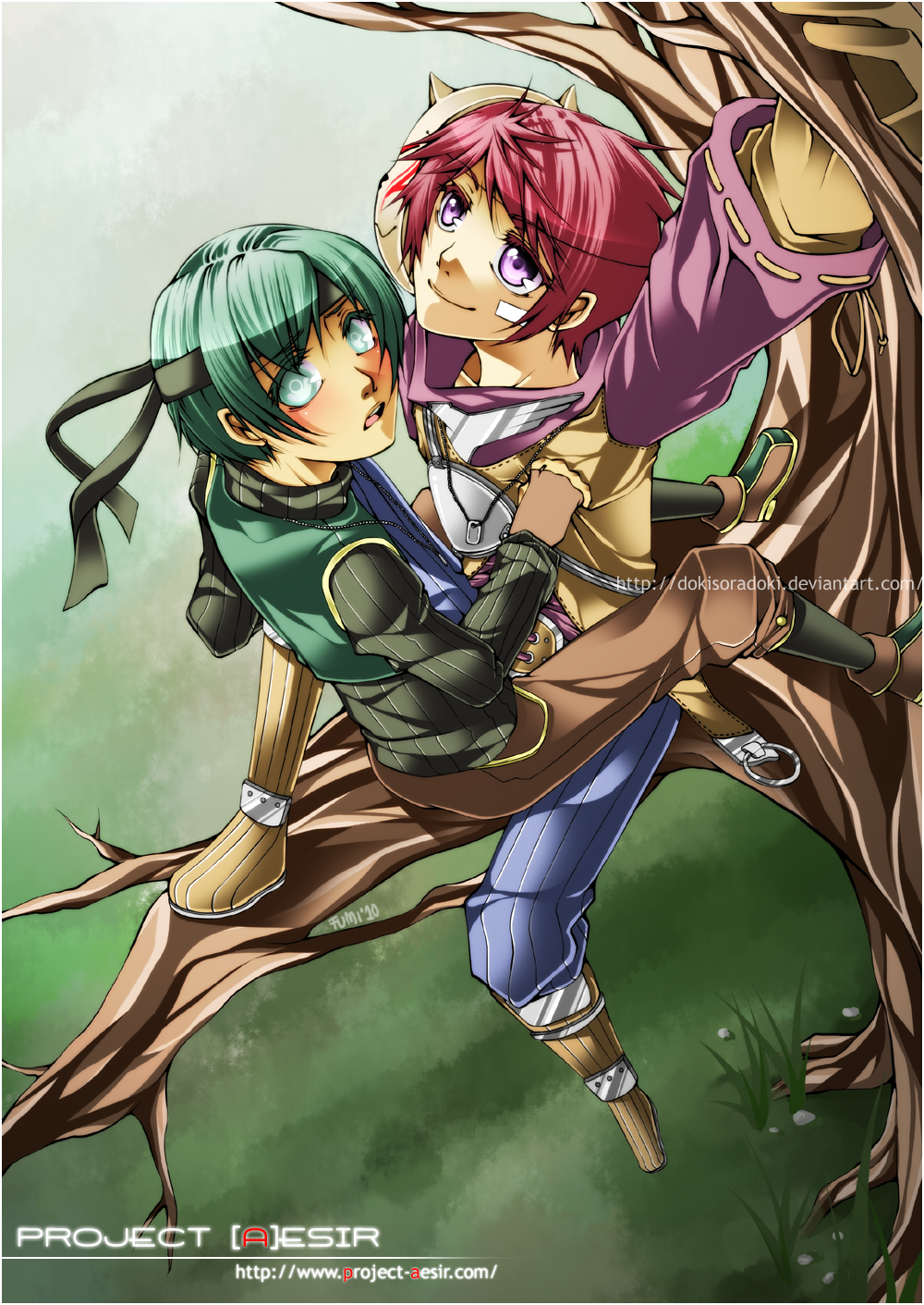 2boys archer_(ragnarok_online) bandaid bandaid_on_cheek bandaid_on_face black_headband blue_shorts brown_gloves brown_vest closed_mouth commentary english_commentary fox_mask full_body fumiddition gloves grass green_eyes green_hair green_vest grey_shirt headband highres long_sleeves looking_at_viewer mask mask_on_head merchant_(ragnarok_online) multiple_boys muneate open_mouth purple_eyes purple_shirt ragnarok_online red_hair shirt short_hair shorts sitting sitting_on_branch smile vest watermark web_address