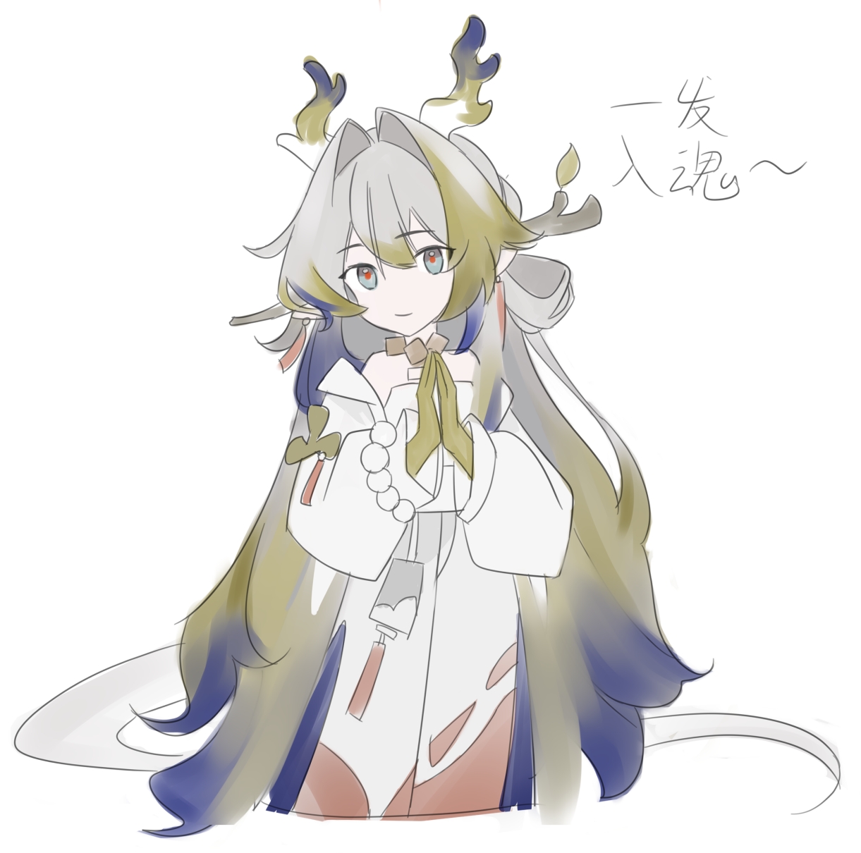1girl arknights blonde_hair blue_hair blue_horns closed_mouth commentary_request cowboy_shot grey_eyes grey_hair hair_intakes highres horns linkai long_hair looking_at_viewer multicolored_hair multicolored_horns red_pupils shu_(arknights) side_horns simple_background sketch smile solo tree_horns very_long_hair white_background yellow_hands yellow_horns