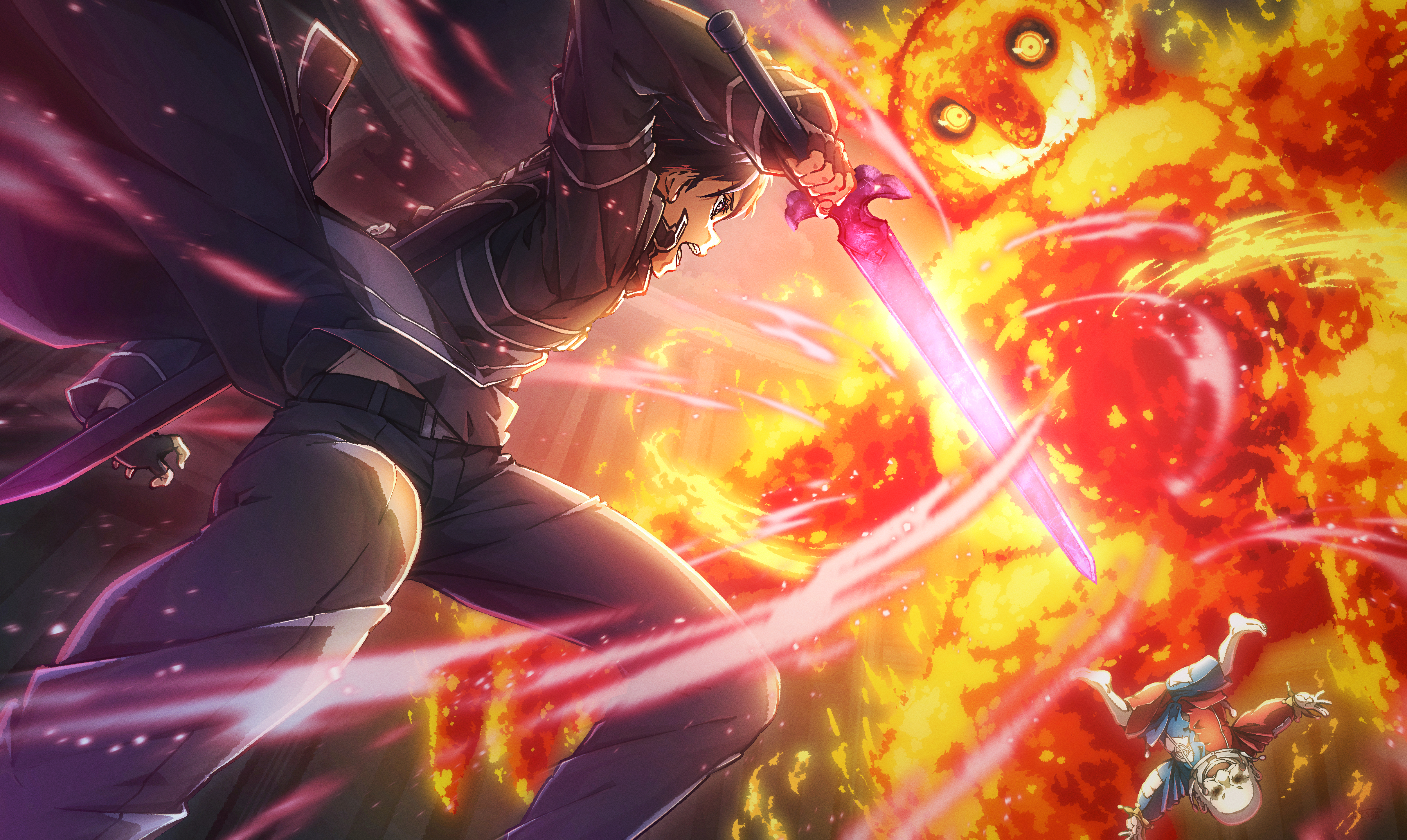 1boy 2boys absurdres battle black_hair coat commission fingerless_gloves fire gloves glowing highres holding holding_sword holding_weapon kirito male_focus multiple_boys oboro_neko pants sheath sword sword_art_online sword_art_online:_alicization weapon