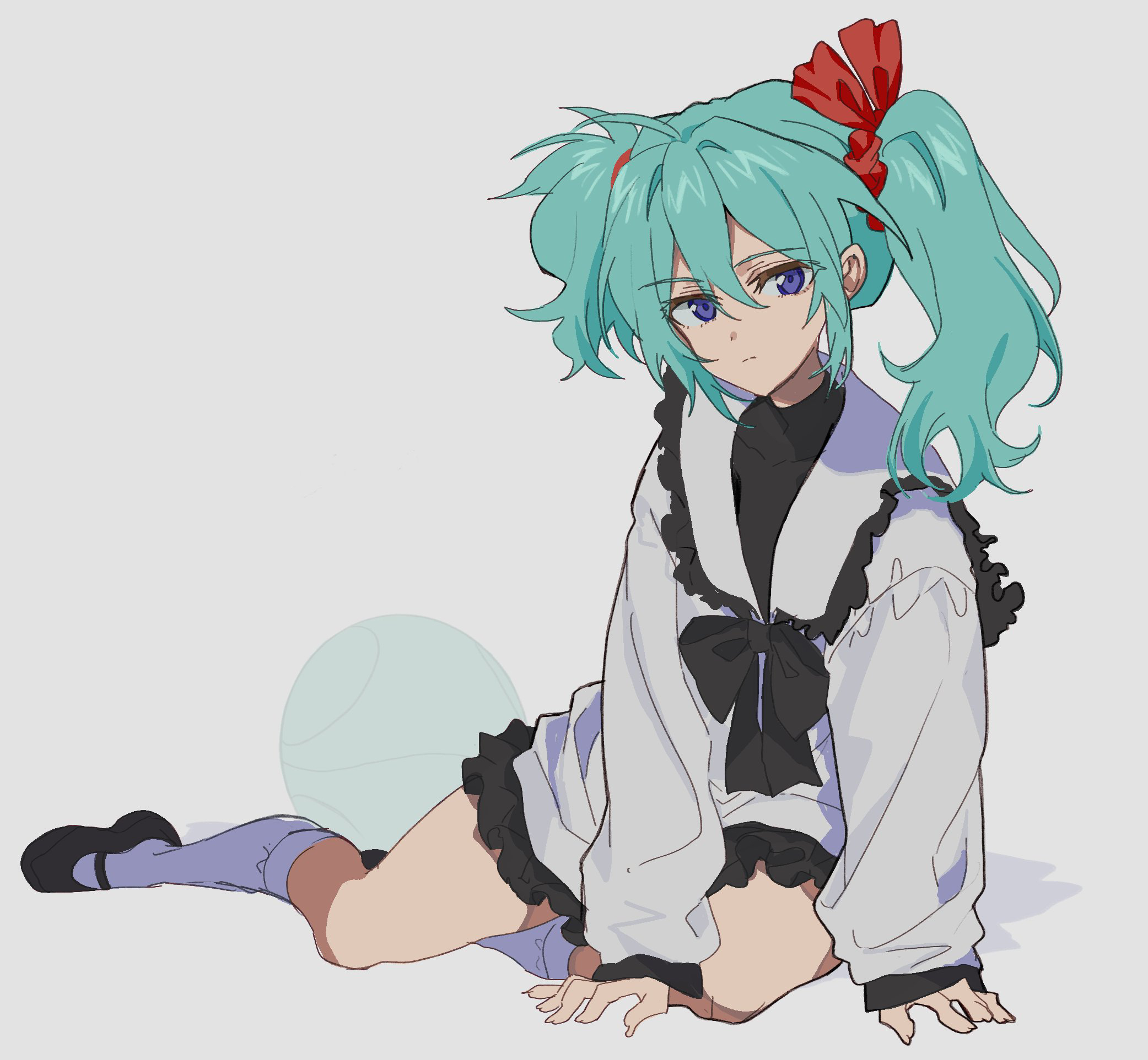 1girl aqua_hair arm_support black_bow black_shoes black_skirt blue_eyes bow bowtie char's_counterattack closed_mouth collared_shirt commentary_request expressionless eyes_visible_through_hair frilled_shirt_collar frills full_body gundam hair_between_eyes hair_bow highres kawachi_rin long_hair long_sleeves looking_at_viewer mary_janes quess_paraya red_bow sailor_collar shirt shoes simple_background sitting skirt sleeves_past_wrists socks solo twintails uneven_twintails white_background white_sailor_collar white_socks yokozuwari