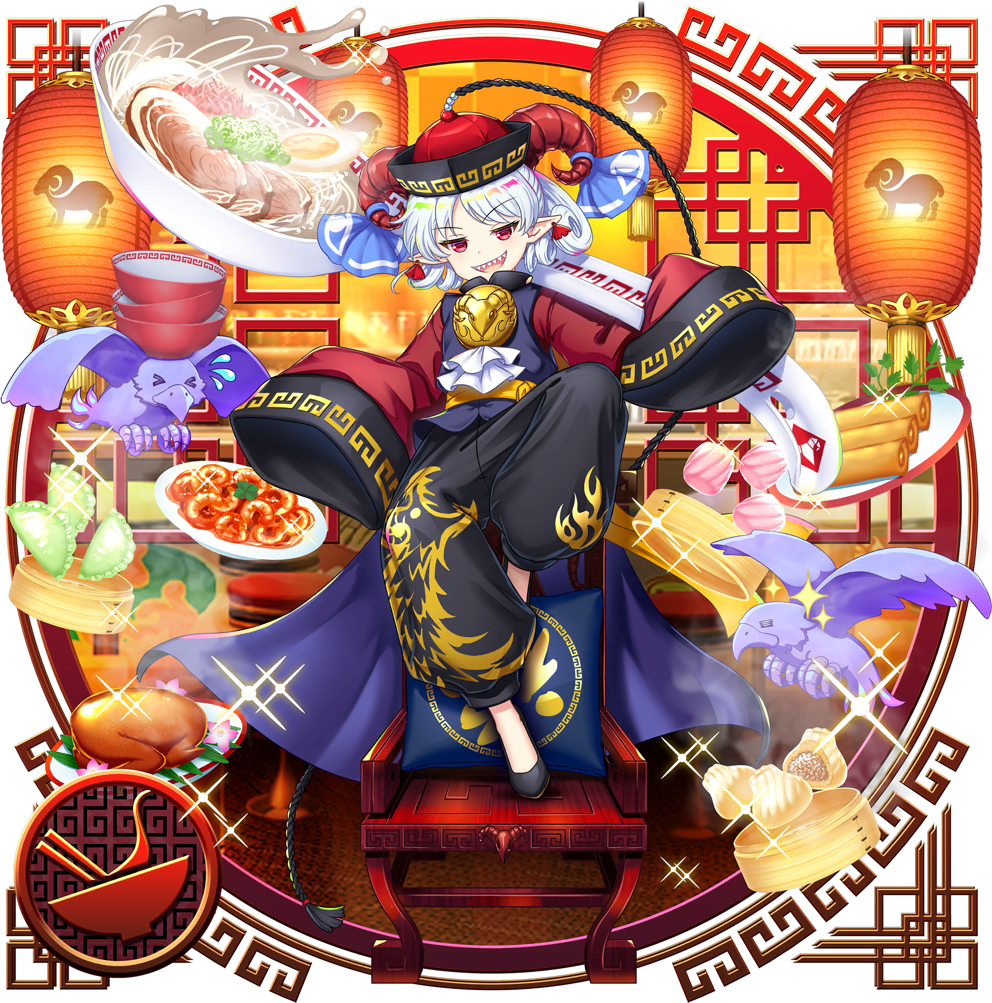 1girl :d alternate_costume bamboo_steamer black_pants blue_ribbon bowl char-siu chinese_clothes commentary curled_horns dumpling eagle_spirit_(touhou) english_commentary food full_body game_cg hair_ribbon hat highres horns jiaozi lantern long_sleeves looking_at_viewer meandros noodles official_art open_mouth oversized_food oversized_object pants paper_lantern plate pointy_ears qingdai_guanmao ramen red_eyes red_horns ribbon rotte_(1109) short_hair shrimp sleeves_past_fingers sleeves_past_wrists smile softboiled_egg solo spoon spring_onion spring_roll standing standing_on_one_leg steamed_bun third-party_source touhou touhou_lostword toutetsu_yuuma toutetsu_yuuma_(all-you-can-devour_banquet) transparent_background white_hair wide_sleeves