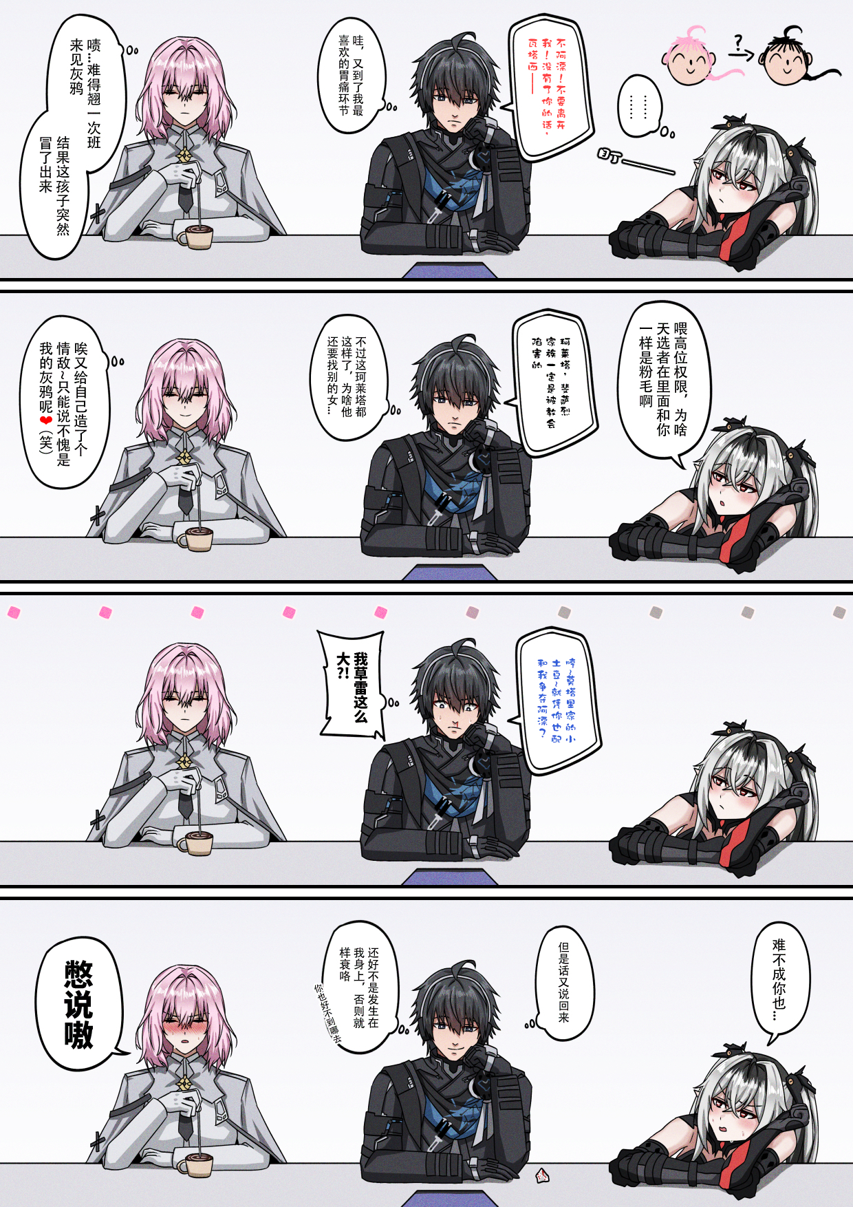 1boy 2girls black_gloves black_hair black_jacket black_streaks blush capelet character_request check_character closed_eyes closed_mouth commandant_(pgr) commentary_request crossed_bangs cup doodle_sensei_(blue_archive) gloves grey_capelet grey_gloves grey_hair grey_shirt hair_between_eyes headgear headphones highres ishmael_(pgr) jacket jetavie_(pgr) long_sleeves mechanical_arms medium_hair military_uniform mismatched_pupils multiple_girls open_mouth pink_hair punishing:_gray_raven red_eyes sensei_(blue_archive) shirt slit_pupils speech_bubble sweatdrop symbol-shaped_pupils teabag teacup thought_bubble translation_request trnr twintails x-shaped_pupils