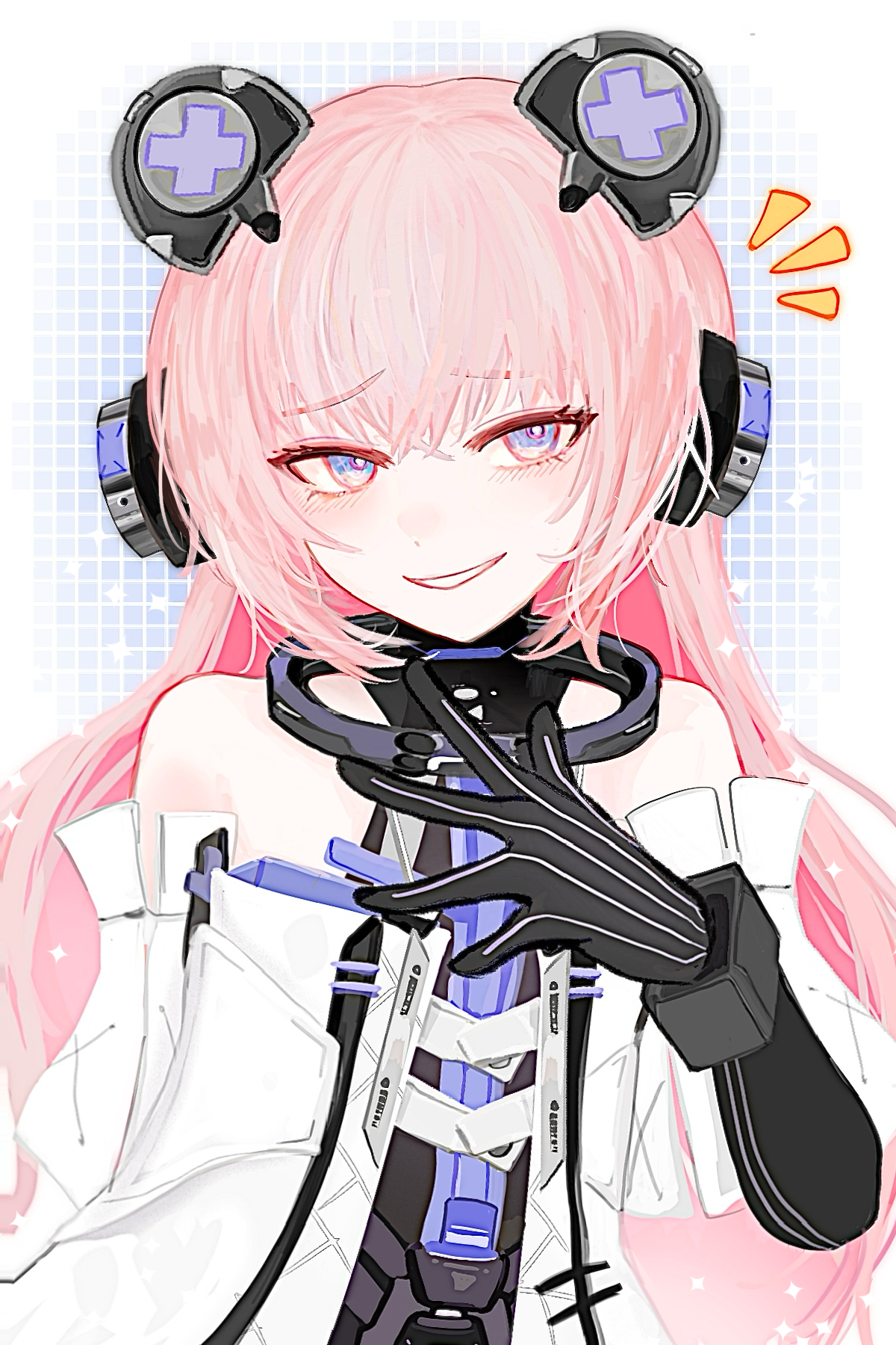 1girl animal_ears bare_shoulders bear_ears blue_eyes coat detached_sleeves fake_animal_ears headgear headphones highres looking_at_viewer mechanical_arms mf_(7554) multicolored_eyes pink_eyes pink_hair punishing:_gray_raven short_sleeves sidelocks smug solo teddy:_decryptor_(pgr) teddy_(pgr) two-tone_eyes white_coat