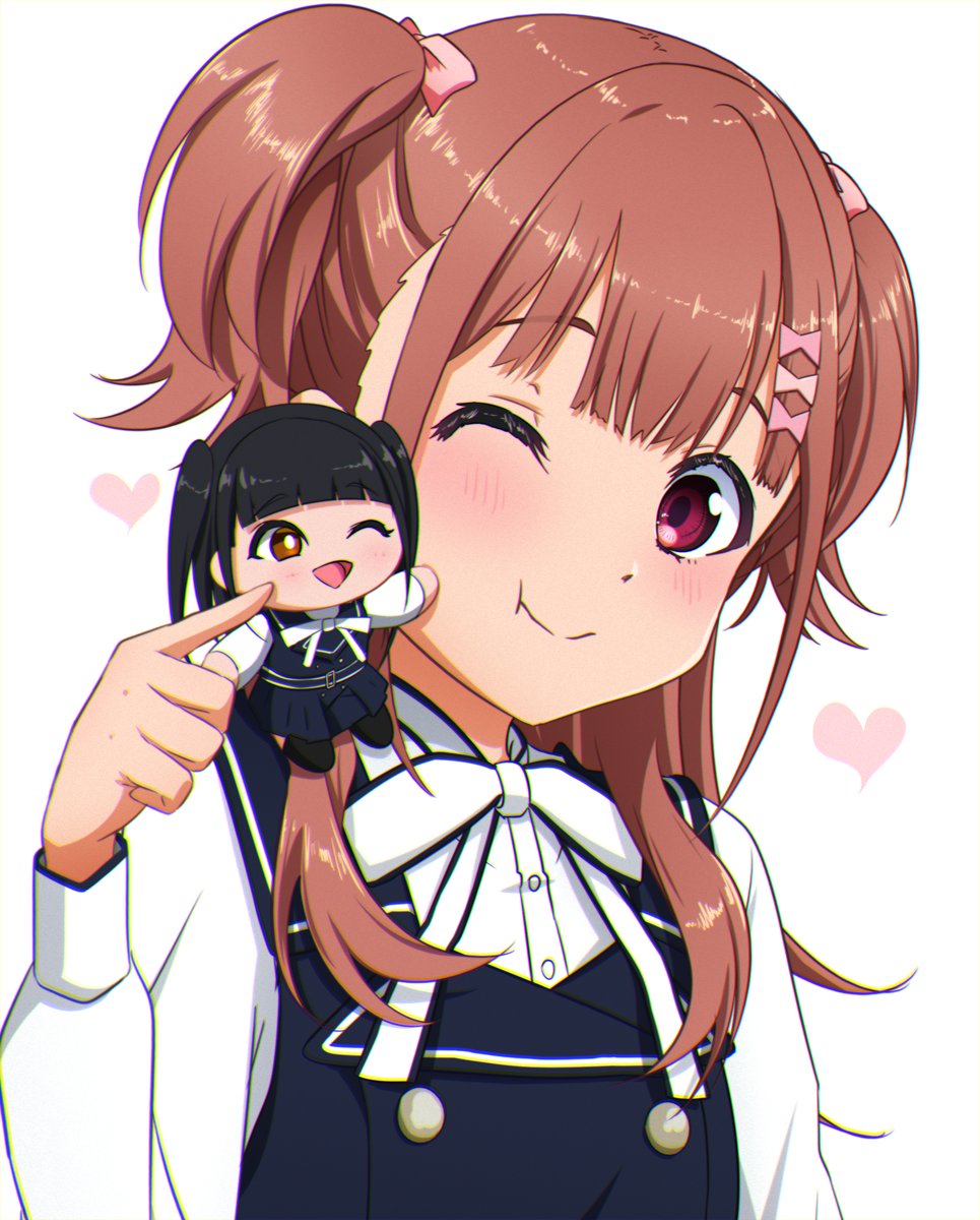 1girl 22/7 ;t black_dress blush bow brown_eyes brown_hair buttons doll double-breasted dress fanged_bangs film_grain hair_bow heart highres holding holding_doll igashiko long_hair long_sleeves neck_ribbon one_eye_closed pinafore_dress pink_bow portrait ribbon sera_honoka shirt sleeveless sleeveless_dress smile stuffed_toy two_side_up white_background white_ribbon white_shirt