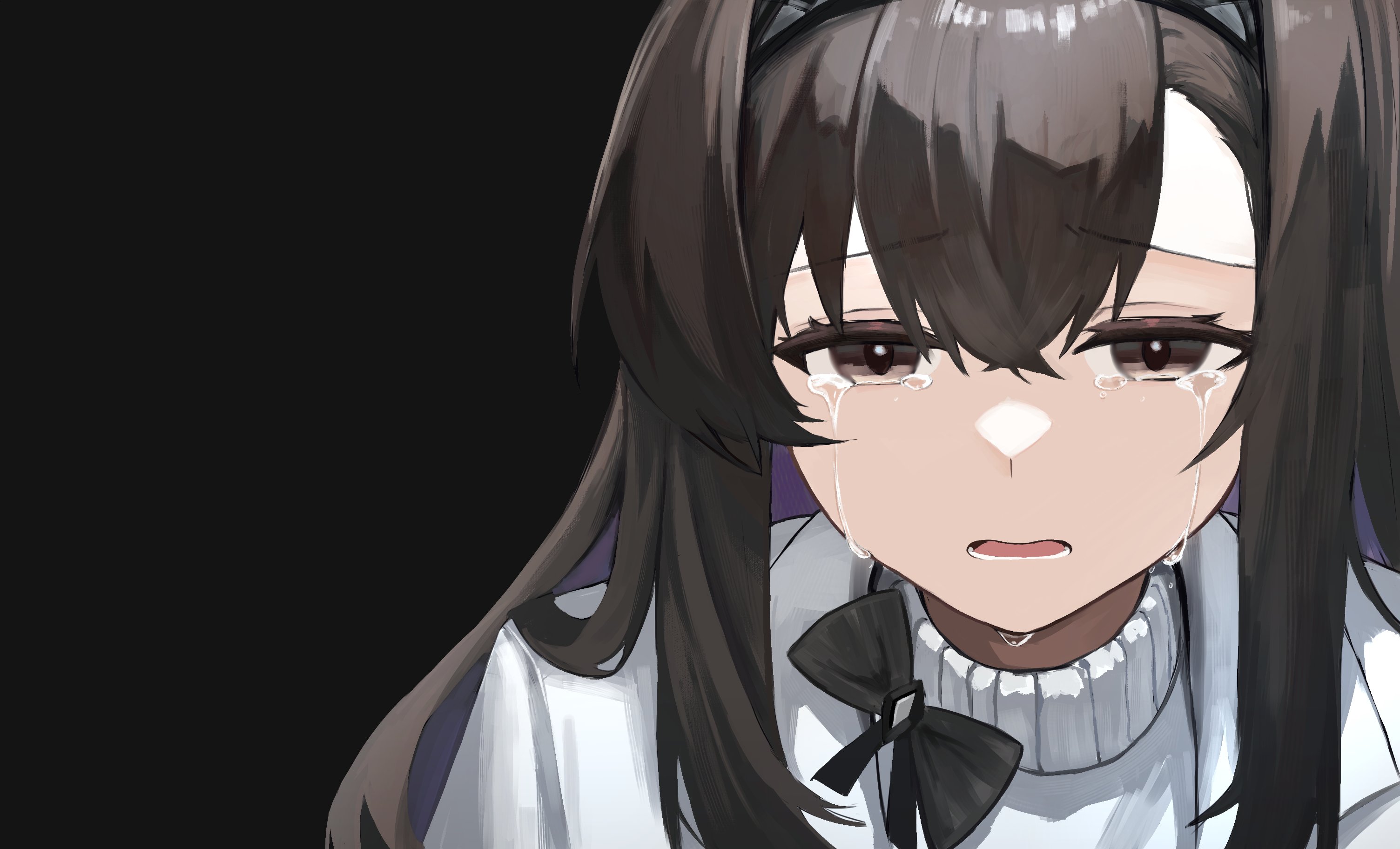 arknights black_background black_headband brown_eyes brown_hair crying crying_with_eyes_open headband highres jager lab_coat open_mouth priestess_(arknights) shirt simple_background streaming_tears sweater tears turtleneck turtleneck_shirt turtleneck_sweater