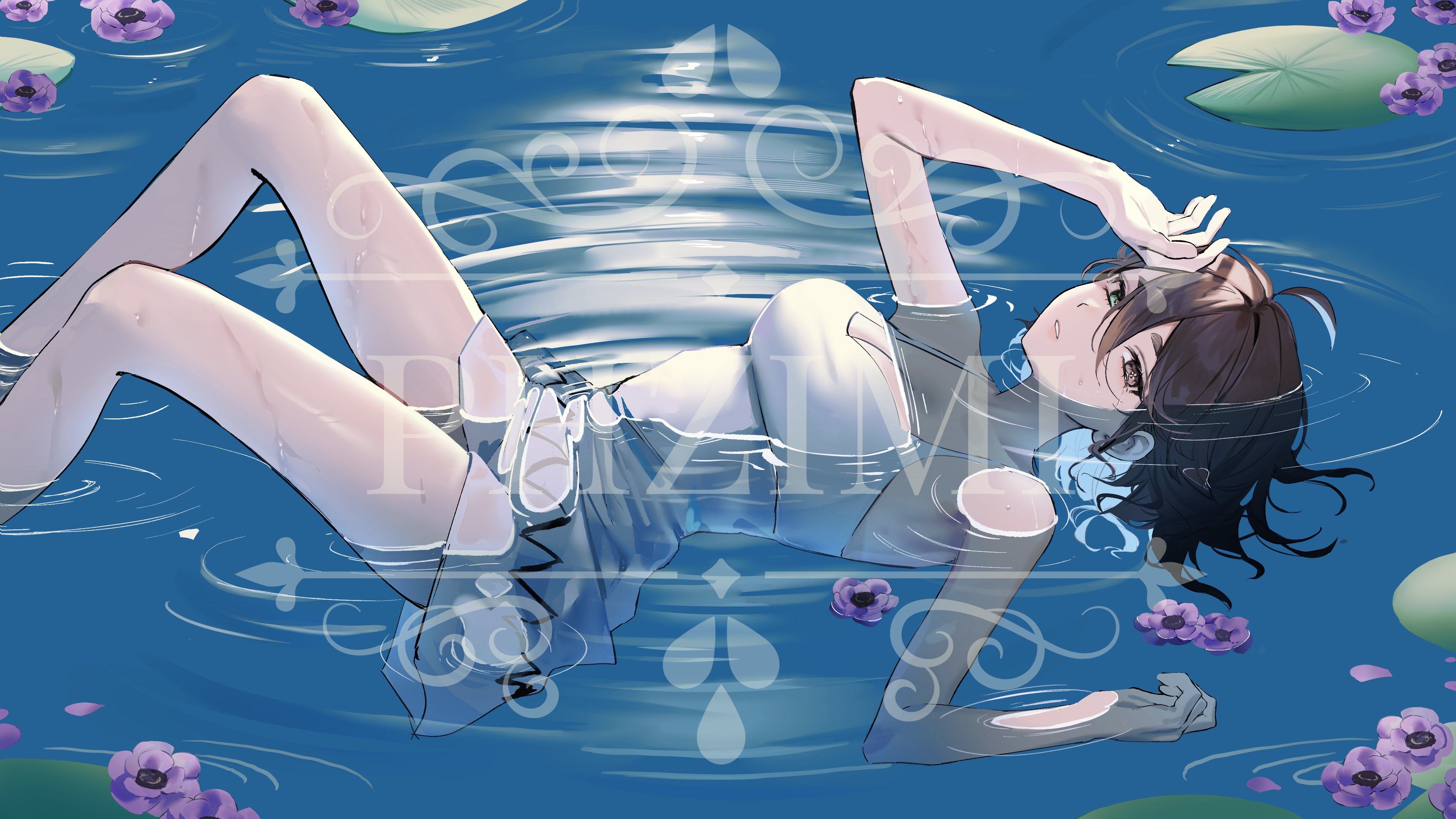1girl absurdres ahoge artist_logo blue_hair breasts brown_hair colored_inner_hair commentary_request commission cross-shaped_pupils dress feet_out_of_frame flower hair_between_eyes half-closed_eyes hand_on_own_forehead hand_up heterochromia highres indie_virtual_youtuber knees_up lily_pad logo looking_at_viewer looking_to_the_side lying medium_breasts medium_hair meica_(vtuber) mixed-language_commentary multicolored_hair on_back on_water parted_lips partially_submerged phzimi000 ripples sad sleeveless sleeveless_dress solo spaghetti_strap spanish_commentary sprout-shaped_pupils symbol-shaped_pupils tears virtual_youtuber water water_lily_flower watermark white_dress
