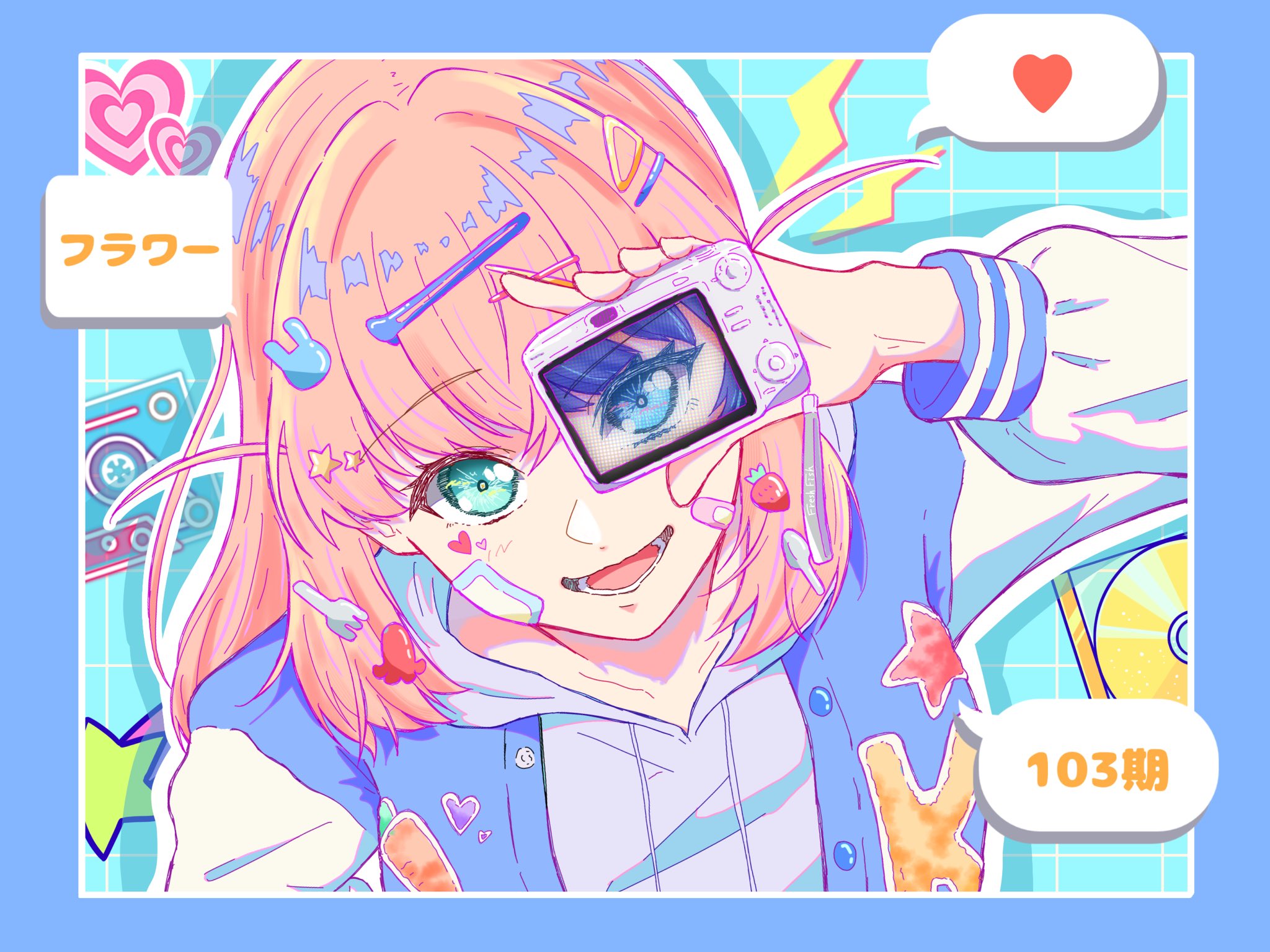 2girls :d aqua_eyes blue_background blue_eyes blue_hair blue_jacket camera cassette_tape catchphrase collarbone commentary food food-themed_hair_ornament food_art fork_hair_ornament freshfish grey_hoodie grid_background hair_ornament hairclip heart highres hinoshita_kaho holding holding_camera hood hoodie initial jacket letterman_jacket lightning_bolt_symbol link!_like!_love_live! long_sleeves looking_at_viewer love_live! lower_teeth_only multiple_girls murano_sayaka open_mouth orange_hair rabbit_hair_ornament revealing_layer smile solo_focus speech_bubble spoon_hair_ornament star_(symbol) star_hair_ornament strawberry_hair_ornament tako-san_wiener teeth translation_request two_side_up upper_body virtual_youtuber white_sleeves x_hair_ornament