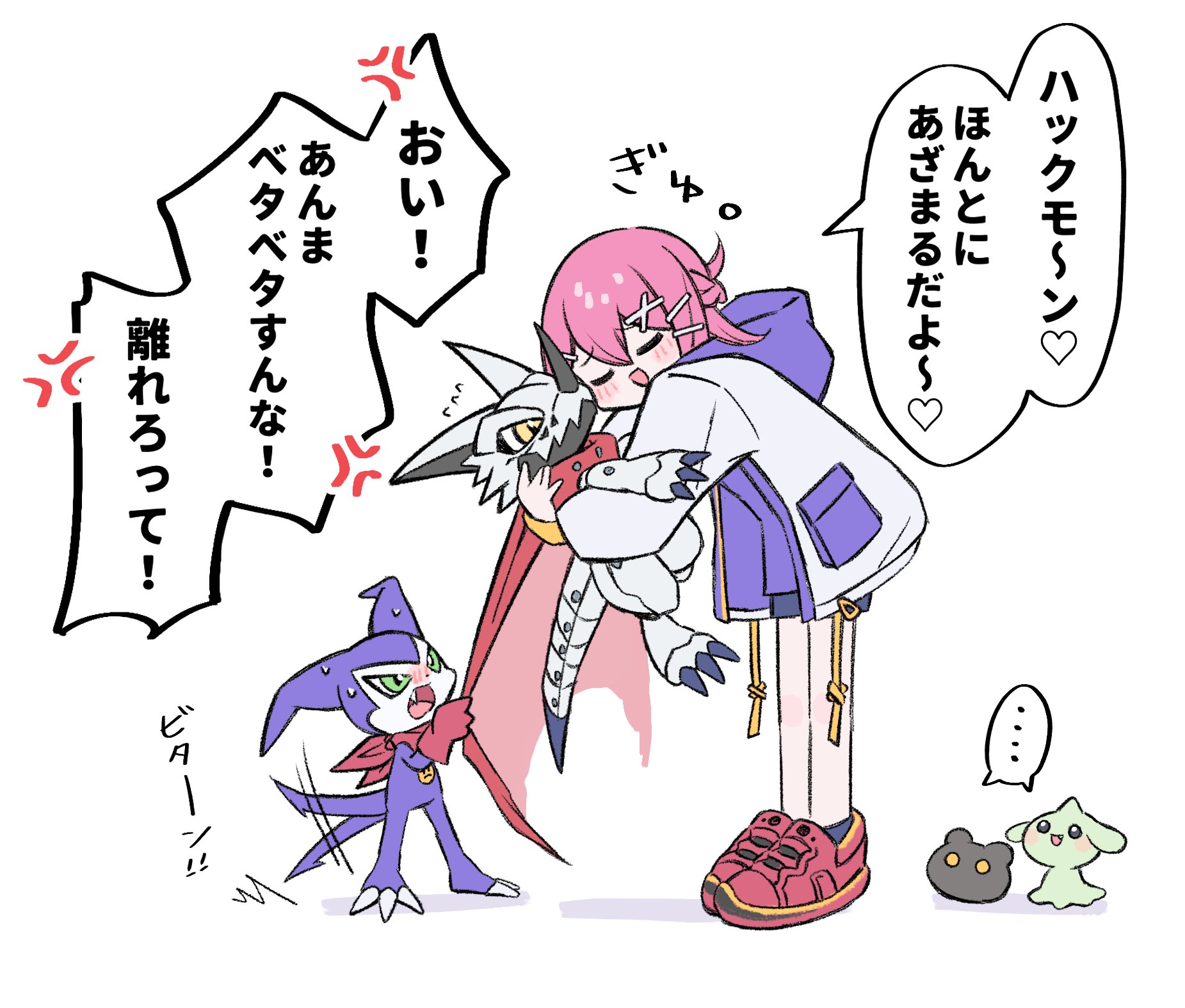 ... 1girl black_shorts blush botamon cape closed_eyes demon_boy digimon digimon_card_game digimon_liberator dragon full_body green_eyes group_picture gummymon hackmon_(digimon) heart highres hood hooded_jacket horns hug impmon jacket nagoshi pink_hair red_cape shorts simple_background single_horn speech_bubble spoken_heart white_background white_jacket yellow_eyes yuuki_(digimon)