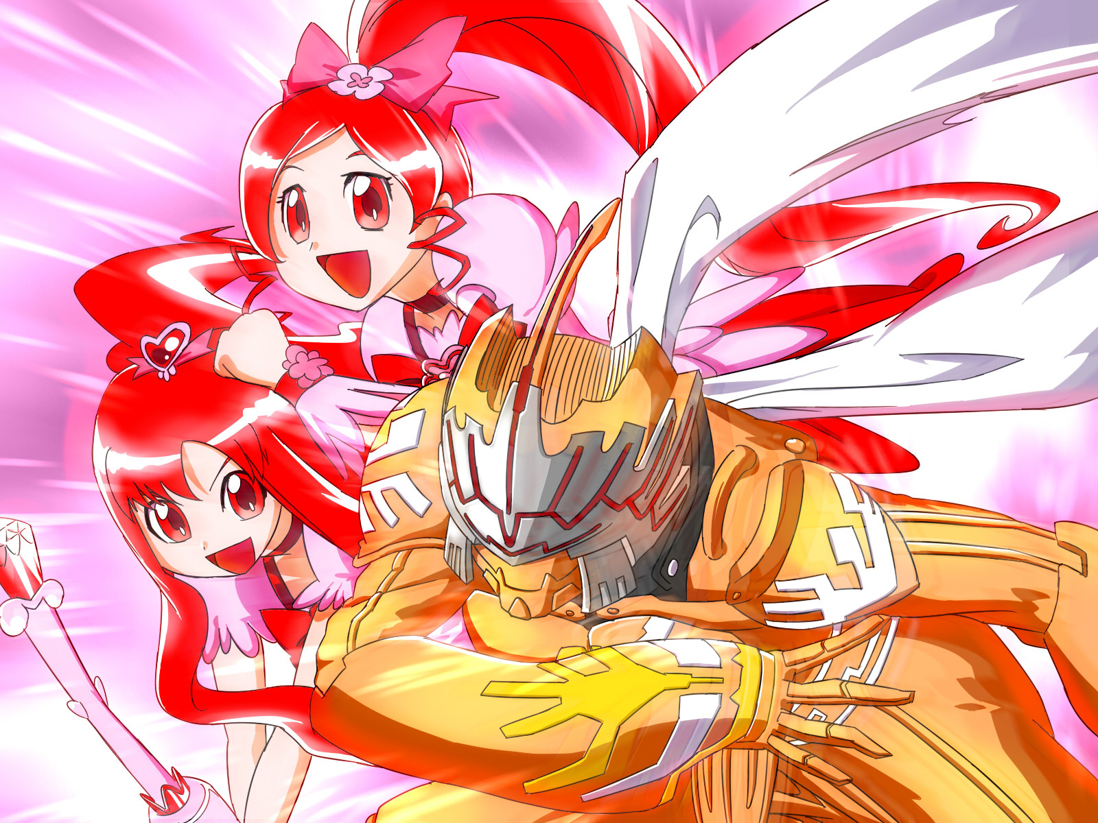 alternate_color armor bow brooch choker cure_blossom cure_marine dashing heart heart_brooch heartcatch_precure! helmet high_ponytail highres jewelry kamen_rider kamen_rider_w long_hair magical_girl motion_lines nasca_dopant nazca_lines official_alternate_color open_mouth orange_armor pink_arm_warmers pink_bow pink_wrist_cuffs ponytail precure red_choker red_eyes red_hair scarf smile taiman_44_koukei wand white_scarf wrist_cuffs