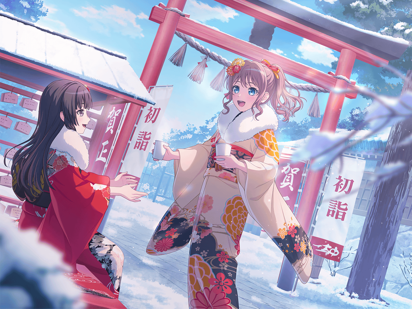 2girls :d bang_dream! black_hair blue_eyes blush brown_hair cloud cup floral_print fur_collar holding holding_cup japanese_clothes long_hair multiple_girls official_art open_mouth outdoors ponytail purple_eyes shirokane_rinko sidelocks sitting sky smile snow standing temple temple_gate wavy_hair yamabuki_saya