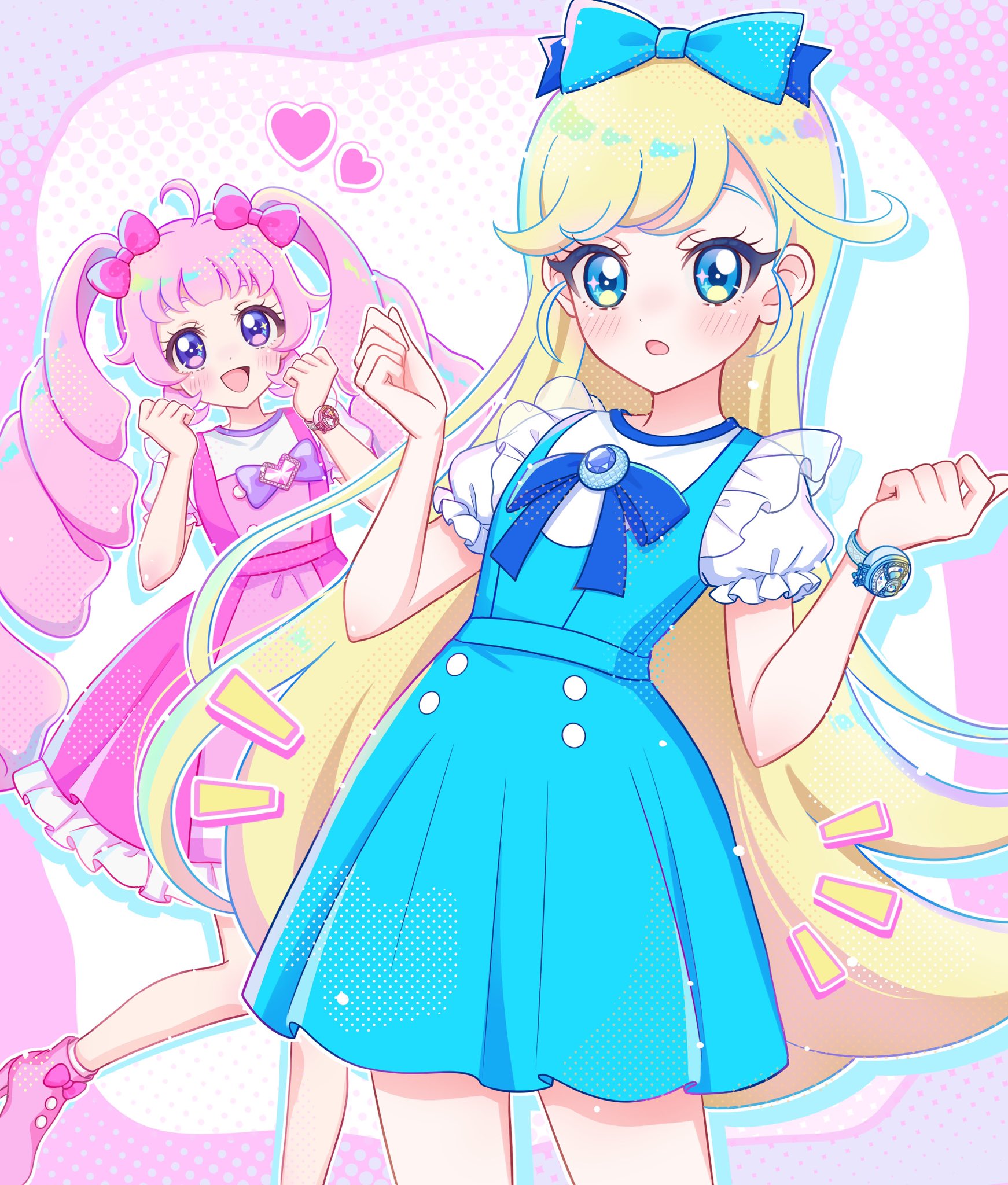 2girls :d :o ahoge aozora_himari blonde_hair blue_bow blue_dress blue_eyes blush bow bracelet clenched_hands colored_lineart cowboy_shot dot_nose dress drill_hair frilled_dress frilled_sleeves frills hair_bow hands_up heart highres himitsu_no_aipri hoshikawa_mitsuki jewelry leaning_back legs_apart long_hair looking_at_viewer medium_dress merrybear multiple_girls open_mouth parted_lips pink_background pink_bow pink_dress pink_hair pink_shoes pretty_series purple_eyes see-through_clothes shoes short_sleeves smile standing standing_on_one_leg straight_hair twin_drills white_background