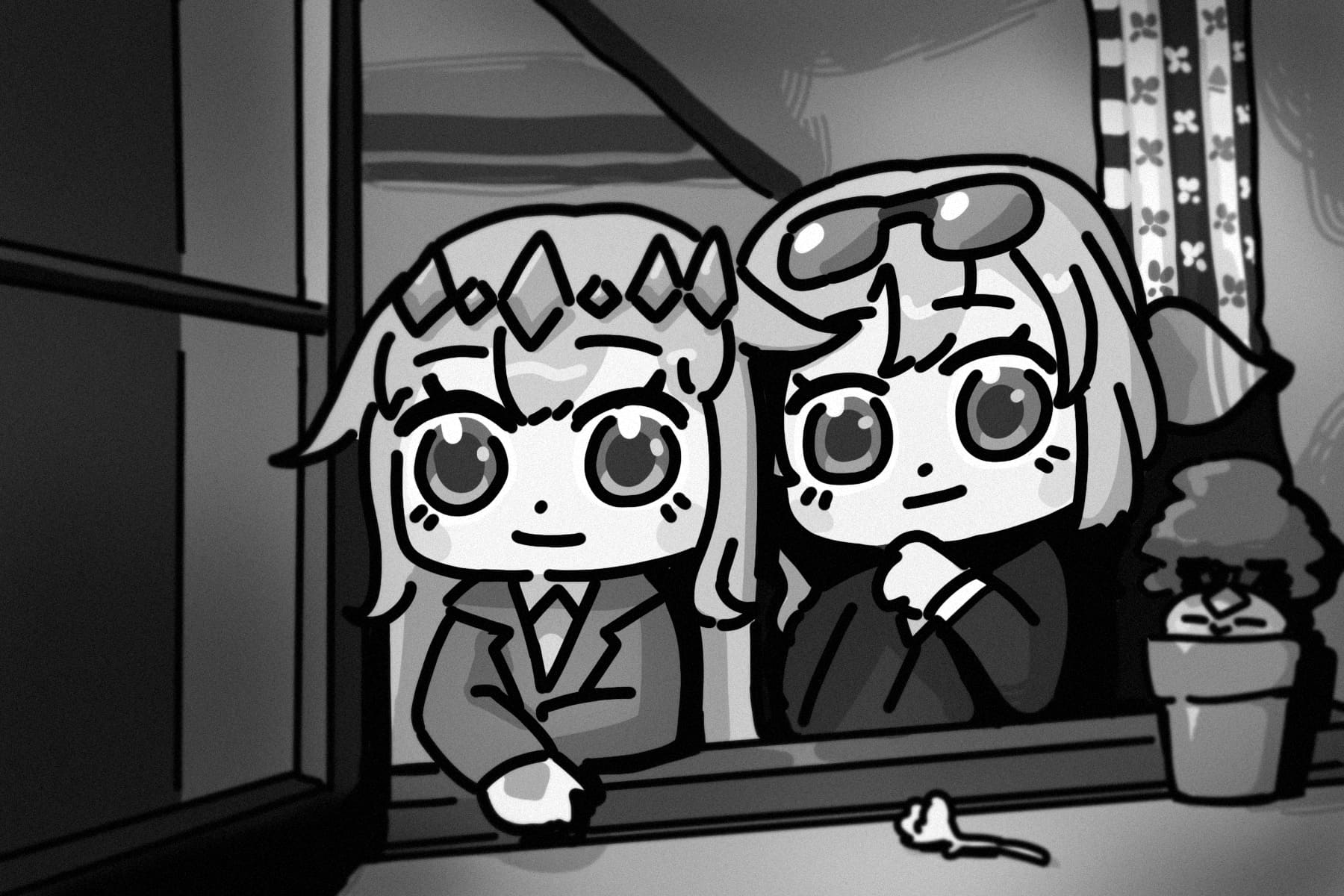 1other 2girls bing_huyue blush_stickers business_suit casablanca chibi commentary english_commentary flower formal_clothes gem_hair_ornament greyscale hair_flaps hand_jewel highres hololive hololive_english hololive_indonesia kaela_kovalskia koseki_bijou long_hair monochrome morocco multiple_girls necktie pebble_(koseki_bijou) plant potted_plant rose suit sunglasses virtual_youtuber window