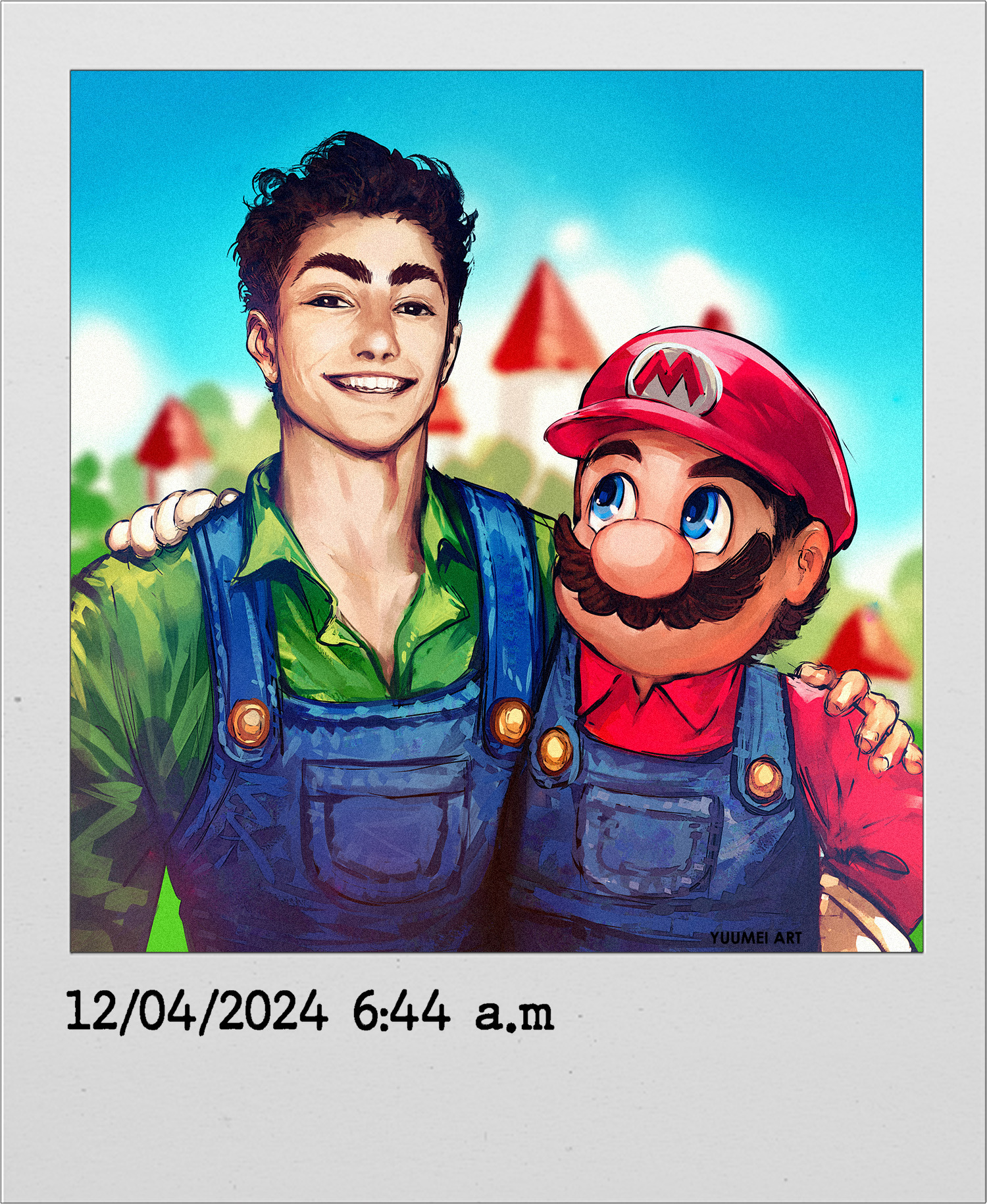 2boys black_eyes blue_eyes blue_overalls blurry blurry_background brown_hair castle commentary cosplay dated day english_commentary facial_hair gloves green_shirt grin hand_on_another's_shoulder hat highres luigi luigi_(cosplay) luigi_mangione male_focus mario mario_(series) multiple_boys mustache name_connection nintendo outdoors overalls photo_(object) real_life red_hat red_shirt shirt smile teeth white_gloves yuumei