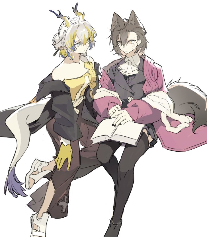 2girls akechi_(826988799) animal_ear_fluff animal_ears apron arknights bare_shoulders black_boots black_coat black_nails black_skirt black_thighhighs blonde_hair blue_hair blue_horns book book_on_lap boots braid brown_pants coat dragon_girl dragon_horns dragon_tail eastern_dragon_horns eastern_dragon_tail grey_hair horns long_hair long_sleeves looking_at_another multicolored_hair multicolored_horns multiple_girls nail_polish off-shoulder_shirt off_shoulder open_book pants penance_(arknights) pink_coat pointy_ears sandals shirt shu_(arknights) shu_(spring_feast)_(arknights) side_braid skirt sleeveless sleeveless_shirt streaked_hair tail thighhighs white_apron white_hair white_horns white_sandals white_shirt wolf_ears wolf_girl wolf_tail yellow_hands yellow_horns