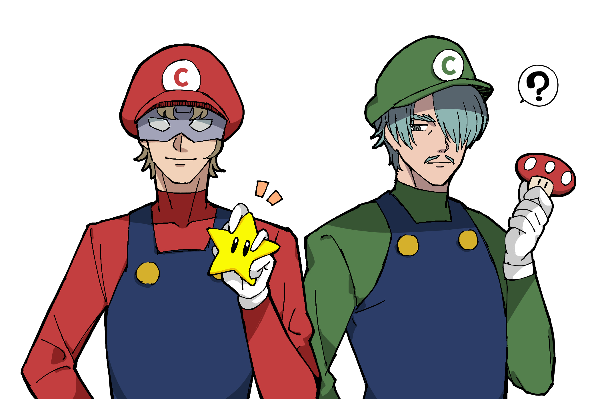 2boys ? blonde_hair blue_hair blue_overalls challia_bull char_aznable char_aznable_(cosplay) commentary_request cosplay facial_hair gloves green_sweater gundam gundam_gquuuuuux highres holding holding_mushroom holding_star looking_at_another looking_at_viewer luigi luigi_(cosplay) male_focus mario mario_(cosplay) mario_(series) mobile_suit_gundam multiple_boys mushroom mustache nintendo overalls red_sweater sabi1234 short_hair simple_background smile speech_bubble spoken_question_mark star_(symbol) super_mushroom super_star_(mario) sweater upper_body white_background white_gloves