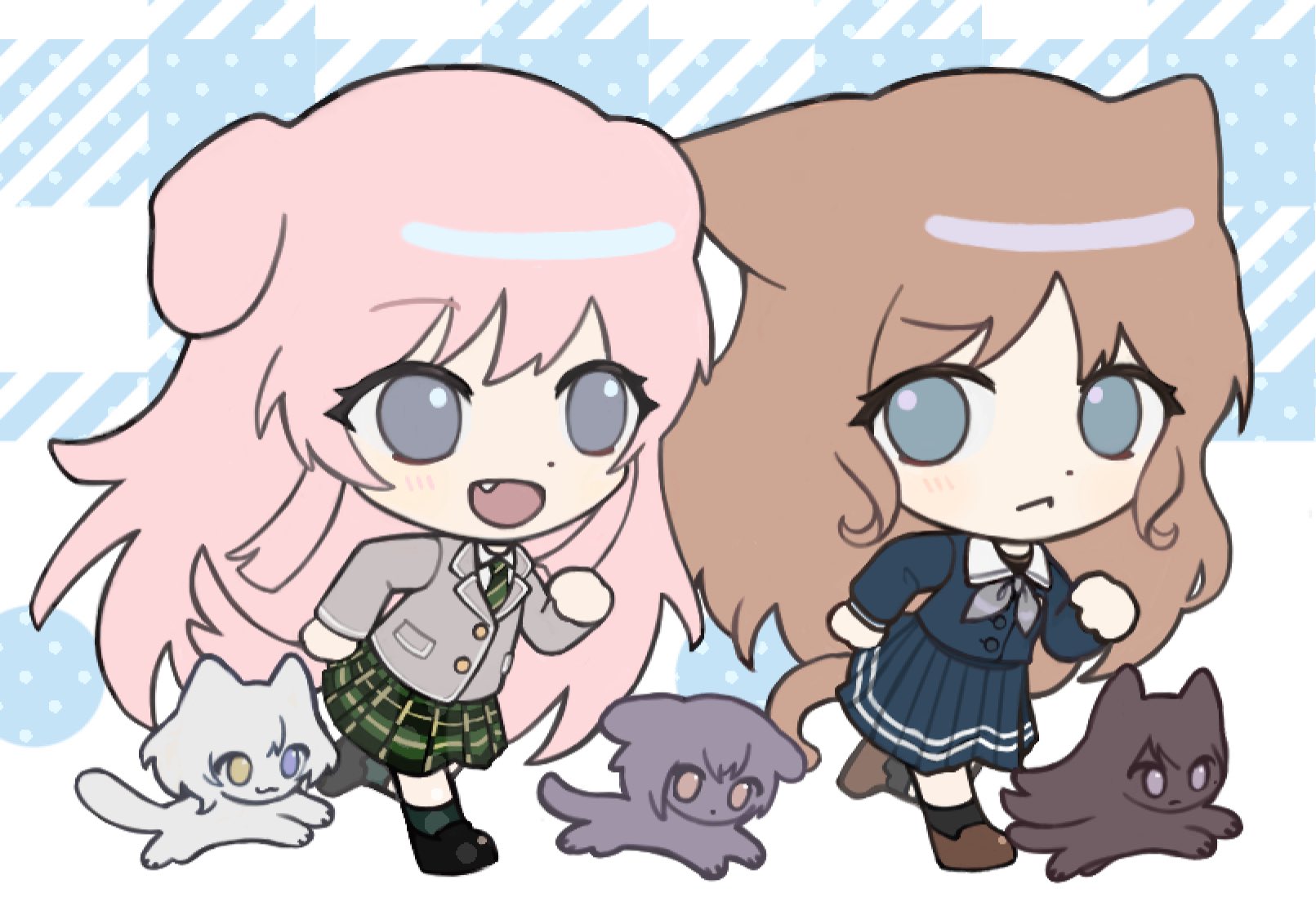 2girls animalization bang_dream! bang_dream!_it's_mygo!!!!! blue_eyes chihaya_anon dashing diagonal-striped_clothes diagonal-striped_necktie green_necktie grey_eyes grey_jacket haneoka_school_uniform highres jacket kaname_raana kata_(atptocl) long_hair long_sleeves multiple_girls mygo!!!!!_(bang_dream!) nagasaki_soyo necktie pink_hair school_uniform shirt simple_background striped_clothes takamatsu_tomori tsukinomori_school_uniform