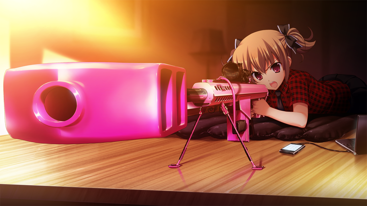 1girl aiming angry anti-materiel_rifle barrett_m82 bipod black_bow black_necktie black_skirt bow brown_hair cellphone computer cute_weapon foreshortening fumio_(ura_fmo) game_cg grisaia_(series) grisaia_no_rakuen gun hair_bow holding holding_gun holding_weapon indoors irisu_makina laptop large_variant_set lying necktie non-web_source official_art on_stomach open_mouth phone plaid_clothes plaid_shirt pleated_skirt red_eyes red_shirt rifle scope shirt short_hair short_sleeves short_twintails skirt smartphone sniper_rifle solo twintails usb_cable variant_set weapon wooden_floor