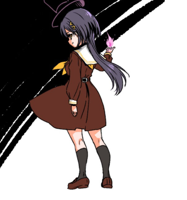 1girl black_background black_socks breasts brown_dress brown_shoes commentary dress fire full_body german_commentary hair_ornament hasu_no_sora_school_uniform hat holding_flame katsuragi_izumi kneehighs kneepits link!_like!_love_live! loafers long_hair long_sleeves looking_at_viewer looking_back love_live! medium_breasts medium_dress neckerchief orange_eyes pink_fire pleated_dress profile sailor_collar sailor_dress school_uniform shinanoya_(satanicad) shoes smile socks solo standing top_hat triangle_hair_ornament virtual_youtuber white_background white_sailor_collar winter_uniform wolf_cut yellow_neckerchief