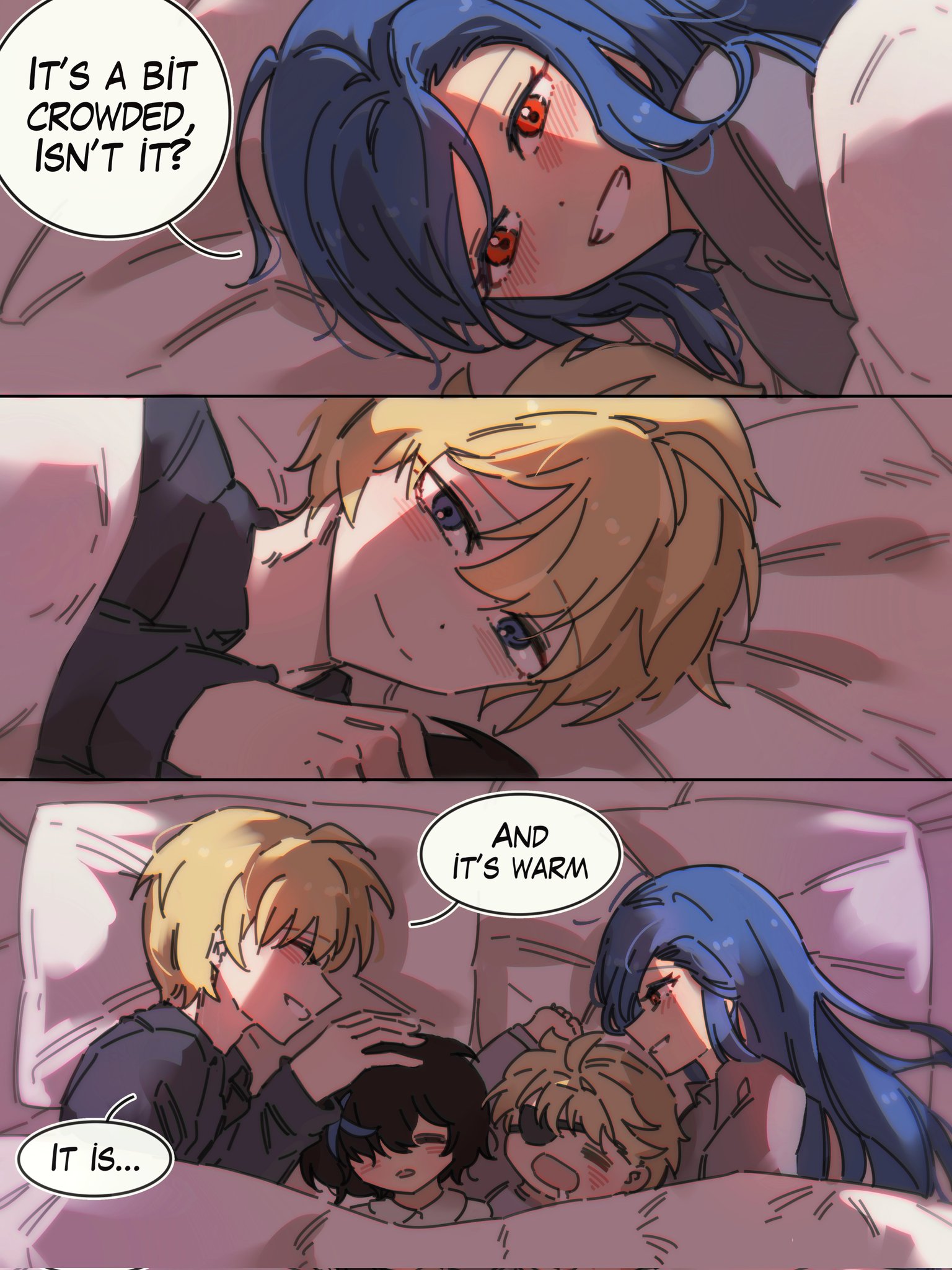 2boys 2girls 3koma aged_down bed bed_sheet black_hair blonde_hair blue_eyes blue_streaks blush comic commentary dizzy_(guilty_gear) drooling english_commentary english_text eyepatch family father_and_daughter father_and_son guilty_gear guilty_gear_strive guilty_gear_strive:_dual_rulers headpat highres husband_and_wife ky_gwangin ky_kiske long_hair looking_at_another lying mother_and_daughter mother_and_son multicolored_hair multiple_boys multiple_girls on_back on_side pillow red_eyes resting saliva sin_kiske smile speech_bubble streaked_hair unika_(guilty_gear)