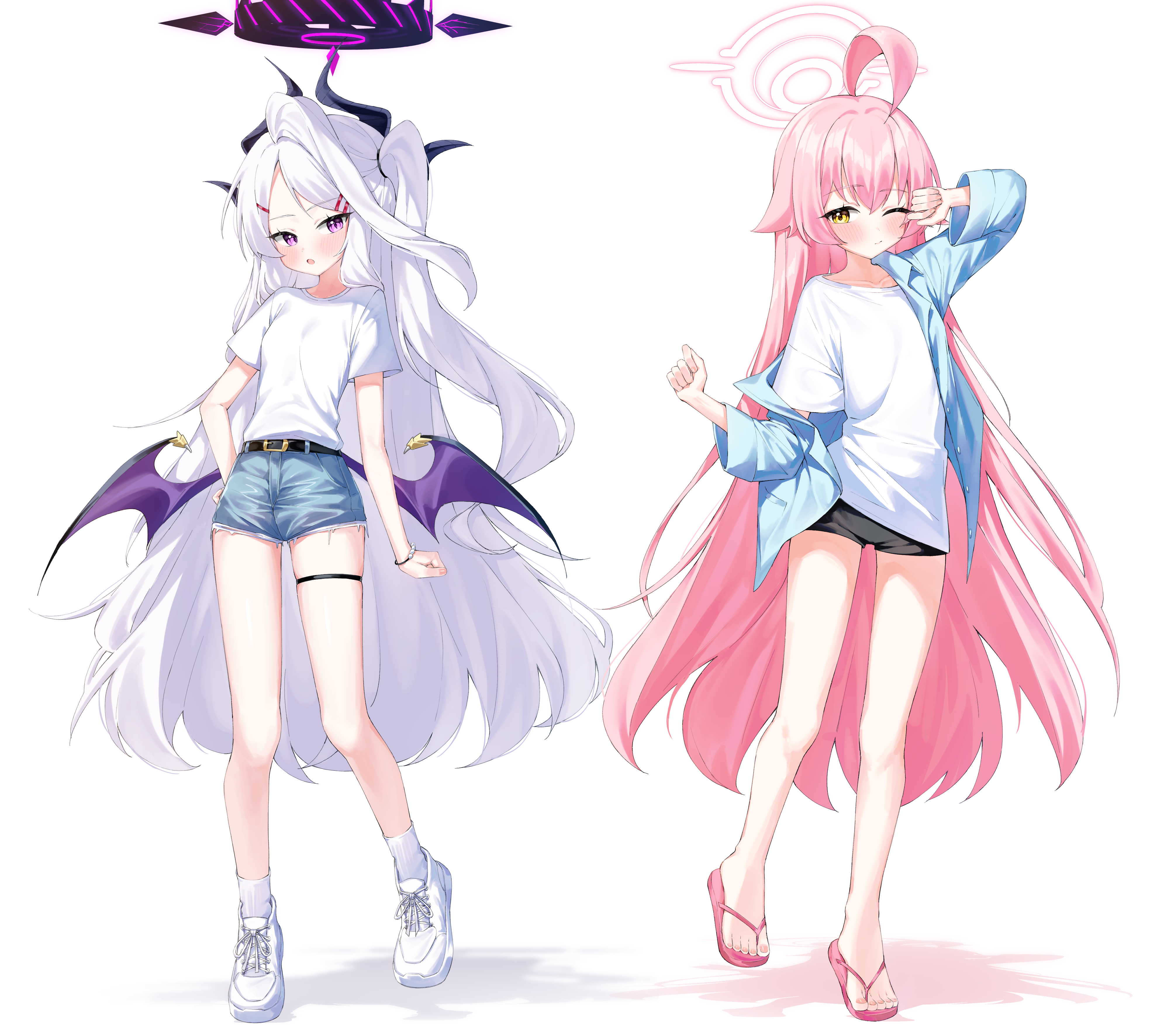 2girls absurdres ahoge alternate_costume black_shorts blue_archive blue_shirt blue_shorts blush bracelet casual cobe commentary_request demon_girl demon_horns demon_wings denim denim_shorts flip-flops full_body halo hand_on_own_hip hand_up highres hina_(blue_archive) horns hoshino_(blue_archive) huge_ahoge jewelry long_hair low_wings multiple_girls multiple_horns one_eye_closed one_side_up open_clothes open_mouth open_shirt oversized_clothes pink_hair pink_halo purple_eyes sandals shirt shoes short_shorts short_sleeves shorts simple_background sneakers socks standing thigh_strap very_long_hair white_background white_hair white_shirt white_shoes white_socks wings