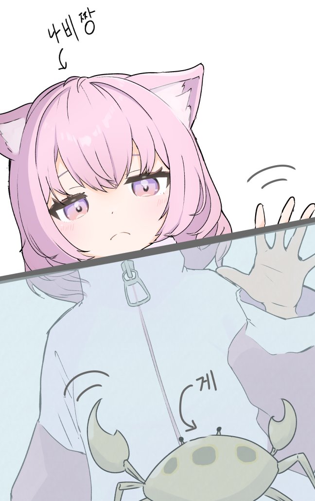 1girl animal_ears cat_ears crab hair_between_eyes hige_potechi indie_virtual_youtuber jacket medium_hair nabins_(iamnabins) pink_eyes pink_hair simple_background track_jacket virtual_youtuber waving white_background
