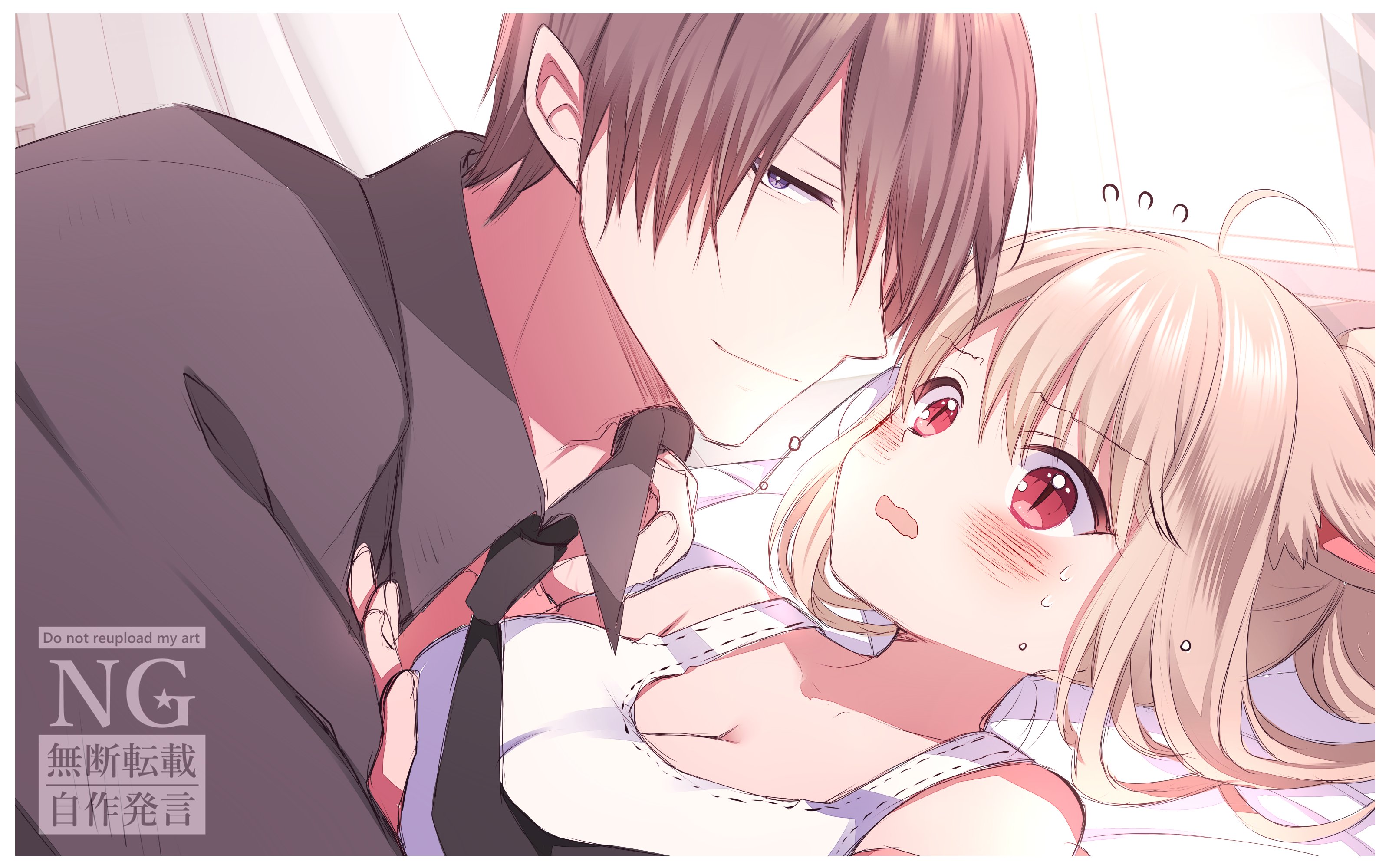 1boy 1girl absurdres animal_ears ayamisiro bare_shoulders black_necktie black_shirt breasts brown_hair cat_ears cat_girl cleavage collared_shirt elezen elf final_fantasy final_fantasy_xiv highres miqo'te necktie pointy_ears purple_eyes red_eyes shirt sleeveless sleeveless_shirt warrior_of_light_(ff14) white_shirt