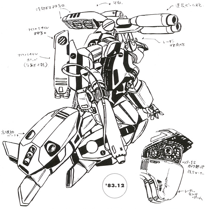 1980s_(style) 1983 battroid cable character_name concept_art dated energy_cannon gunpod jolly_roger kawamori_shouji machinery macross macross:_do_you_remember_love? mecha mecha_focus missile_pod monochrome no_humans official_art oldschool production_art retro_artstyle robot scan science_fiction shoulder_cannon traditional_media u.n._spacy vernier_thrusters vf-1 vf-1_strike vf-1s white_background
