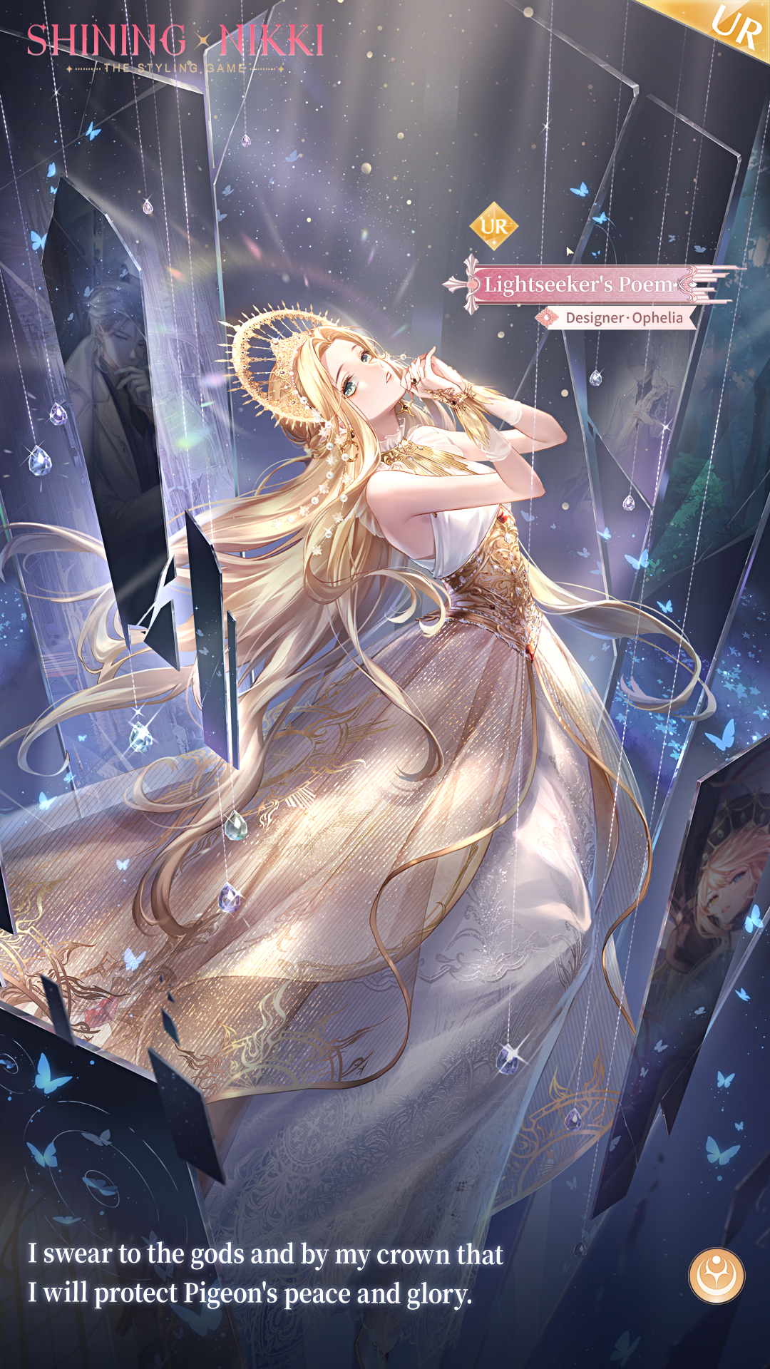 1girl aqua_eyes artist_request bare_shoulders beads bikini blonde_hair blue_butterfly bridal_gauntlets bug butterfly character_name collared_dress copyright_name corset different_reflection dress elf english_text expressionless floating_tears full_body glass gleam glowing gold_bikini gown ha_co hair_beads hair_ornament halo halo_behind_head highres insect layered_dress leaning_back light_rays lightbringer's_ode_(shining_nikki) lipstick logo long_dress long_hair long_sidelocks makeup mercury_(shining_nikki) mirror nikki_(series) official_art ophelia_(shining_nikki) own_hands_together parted_lips pink_lips pointy_ears reflection shining_nikki sidelocks sleeveless sleeveless_dress solo space sparkle spiked_halo swimsuit teardrop teeth third-party_source very_long_hair white_dress yellow_bridal_gauntlets yellow_corset yellow_dress yellow_halo