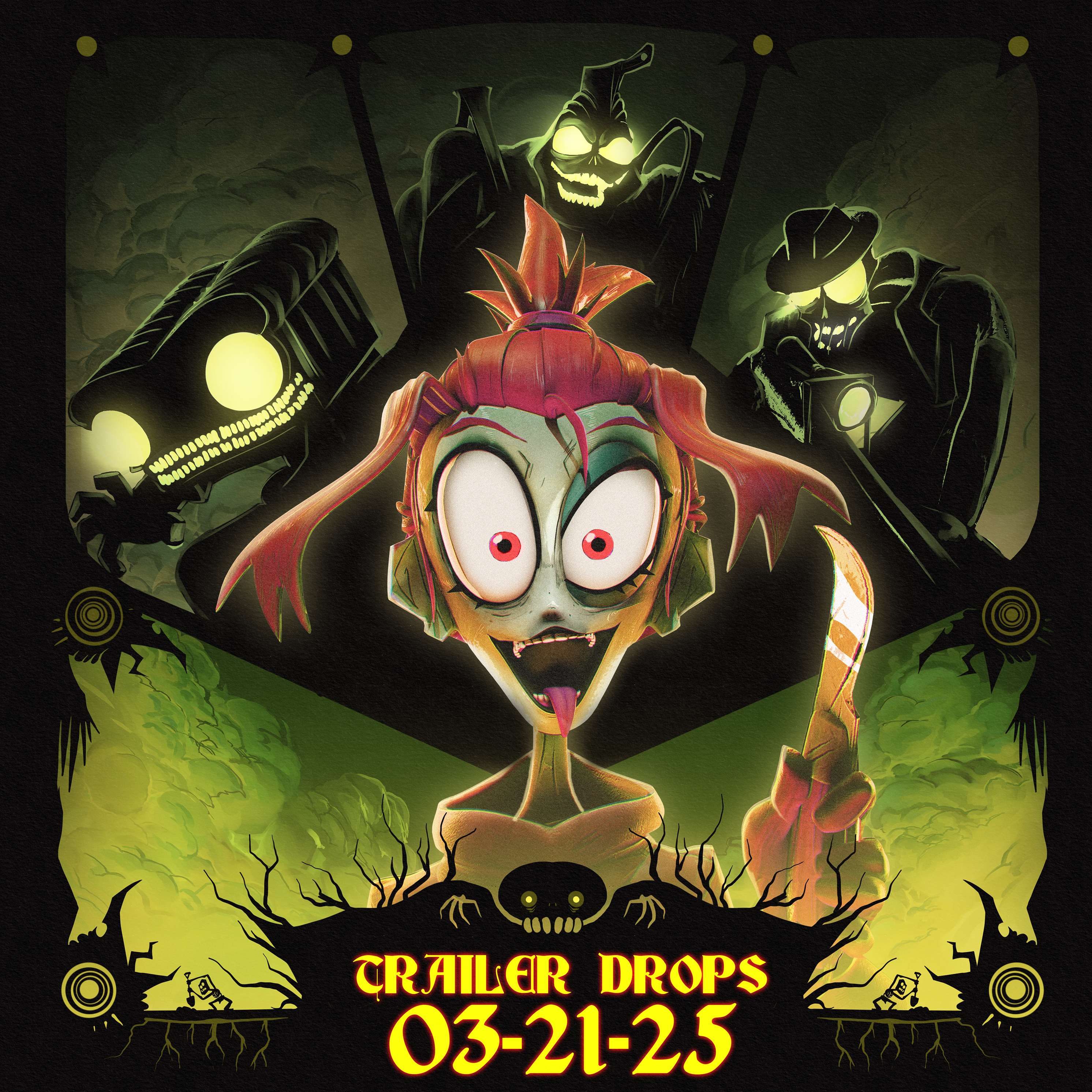 1girl 2025 3boys absurdres aiming apron artist_request black_border border breadhead brown_gloves cleaver coat colored_skin commentary curtained_hair dated digging english_commentary english_text extra_teeth eyelashes facing_viewer freckles gas glitch_productions gloves glowing glowing_eyes green_eyes green_skin gun hair_intakes hair_tie half_updo high_ponytail highres holding holding_gun holding_knife holding_shovel holding_weapon ken_the_butcher knife lapels long_sleeves looking_at_viewer melancholy_hill monster_boy monster_girl mud_(the_gaslight_district) multiple_boys no_pupils official_art open_hand open_mouth orange_hair ponytail red_eyes rifle scope short_ponytail shovel skeleton skull smoke sniper_rifle teeth the_gaslight_district tongue tongue_out turtleneck weapon